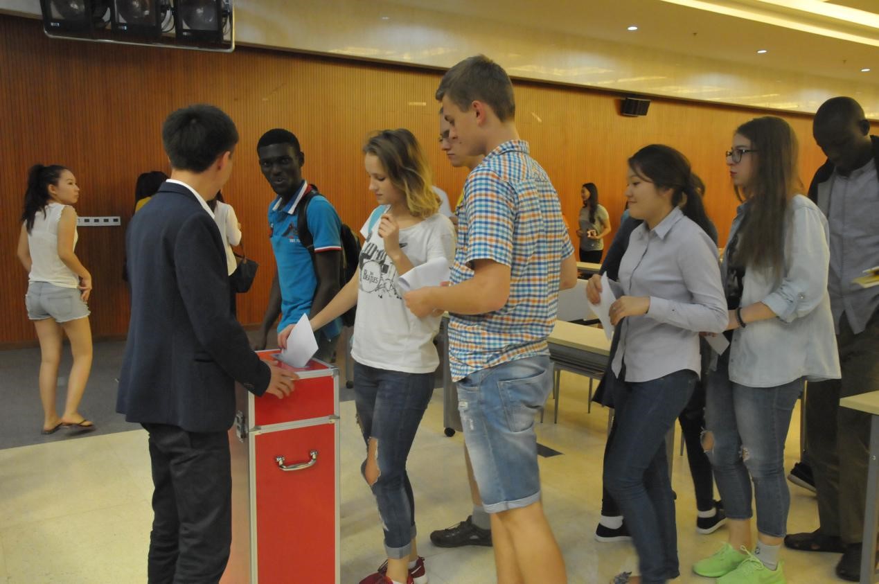 在主持人介绍了选举规则和投票方法之后,竞选演讲正式开始。来自6个国家的16位不同国籍的竞选人依次上台发表演说,他们分别就自己对学生会的认识,以及在过去工作中取得的优异成绩,对未来工作的展望等方面做出了激情的演讲,并博得了台下同学的热烈喝彩。所有演讲结束之后,在现场工作人员的组织下,到场的留学生们依次投下自己神圣的一票。最后,竞选同学和大会工作人员合影留念,选举大会圆满结束。
