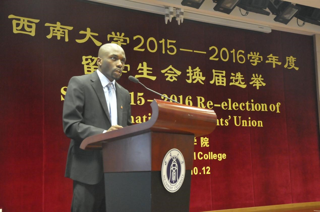 前任留学生会主席阿普杜同学对上届留学生会工作进行了总结。他特别提到2014-2015学年留学生会参与的国际文化节、泰国宋干节等重要活动,充分赞扬了留学生会各个成员积极配合,团结一致的优良传统。他希望下一届留学生会延续这一宗旨,并祝愿他们的工作取得更大成功。