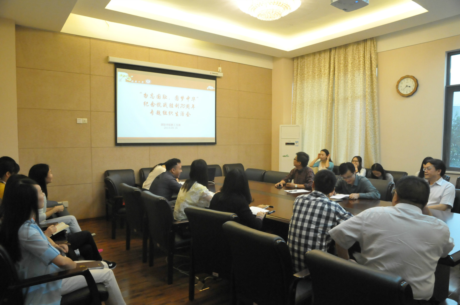 2015年9月18日下午3:30,必赢776net教工党支部在紫云楼310会议室开展纪念抗战胜利70周年“勿忘国耻,圆梦中华”专题组织生活会。必赢776net全体教工党员参加了此次组织生活会,会议由支部书记代远鸿主持。