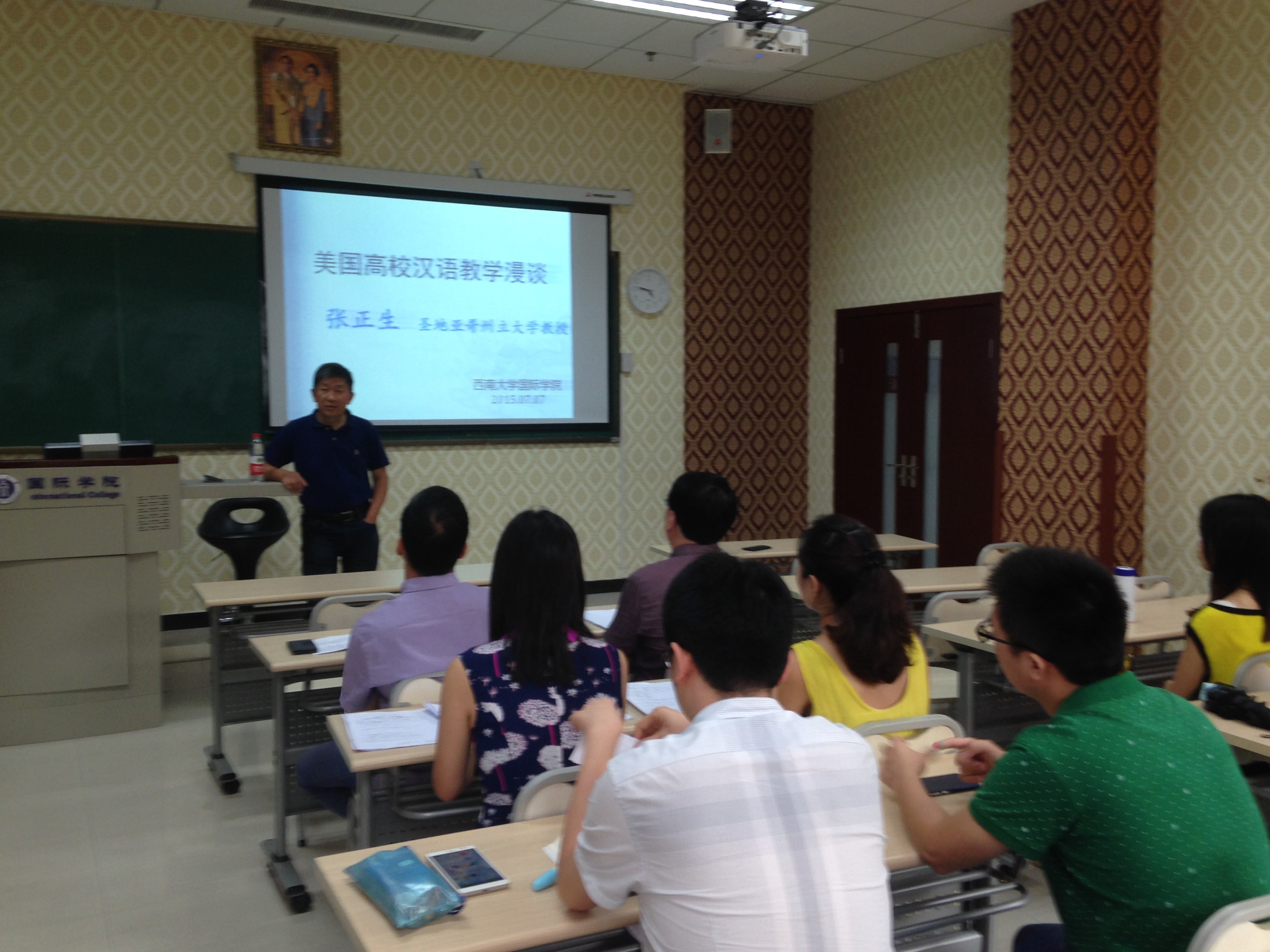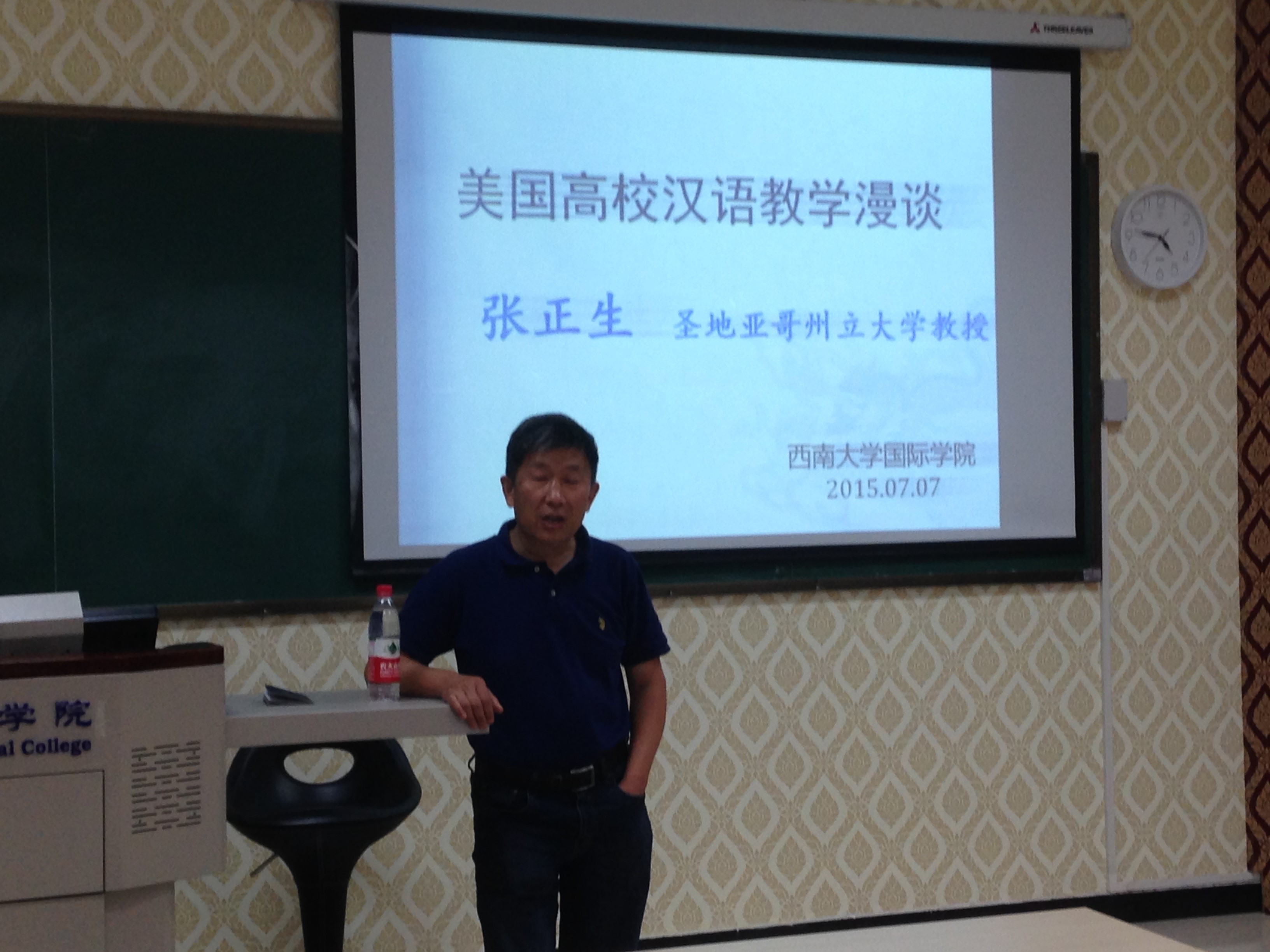 2015年7月7日下午,美国圣地亚哥州立大学教授张正生在必赢776net210教室举行了题为《美国高校汉语教学漫谈》的学术报告。必赢776net全体教师和部分汉语国际教育硕士研究生参加讲座。