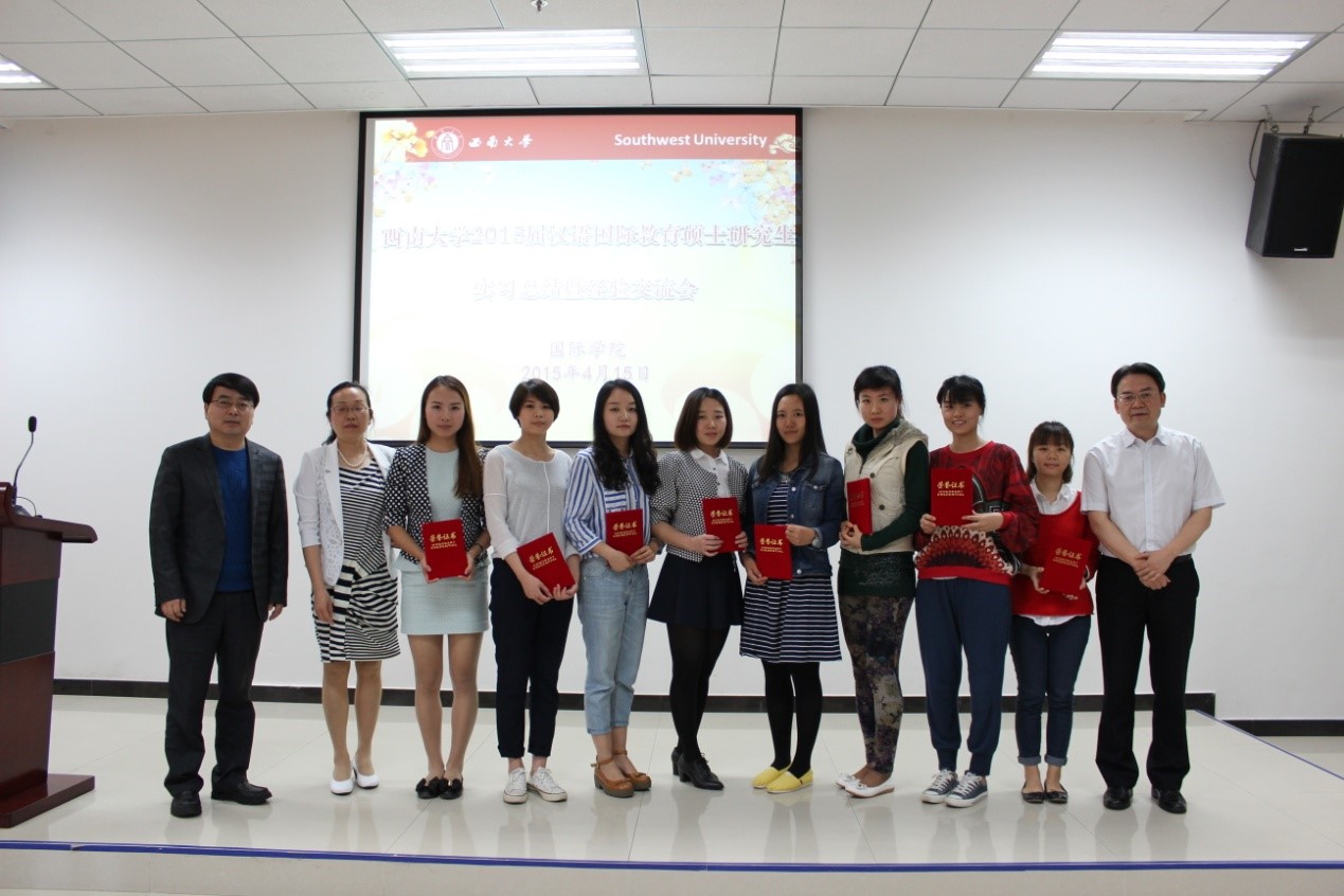 最后,张家政副院长宣读了关于表彰2013级汉语国际教育硕士优秀实习生的决定,到会领导为优秀实习生颁发了荣誉证书。实习汇报结束后,2013级与2014级汉语国际教育硕士进行了实习经验的交流。实习总结暨经验交流会在一片欢声笑语中圆满结束。
