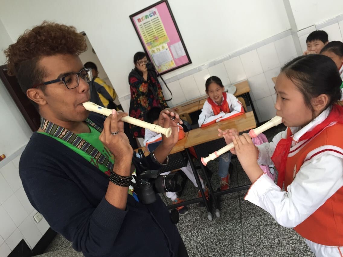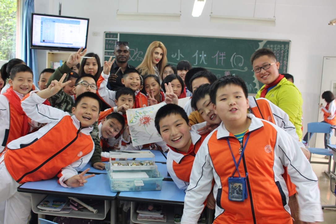 当天恰逢周一,留学生代表们观摩了该校每周例行的升旗仪式,并在升旗台上依次用中文进行自我介绍,留学生们一口流利的汉语引来了小学生们的阵阵欢呼。