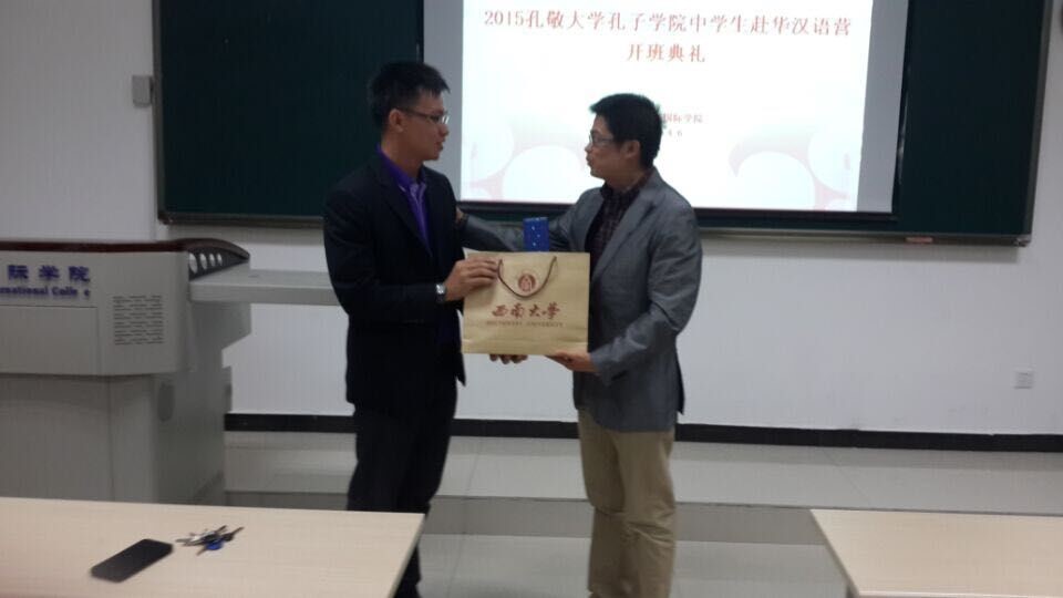 最后张院长为泰国领队老师赠送礼品,全体师生在紫云楼一楼合影留念。开班典礼圆满结束。