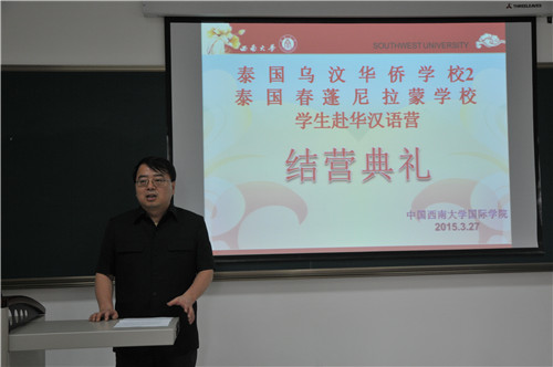 3月27日上午11点,2015年泰国乌汶华侨学校2及泰国春风尼拉蒙学校学生汉语营结营典礼在必赢776net紫云楼312教室举行。必赢776net张家政副院长,泰国乌汶华侨学校2校董WILAI TRIROJPORN女士,必赢776net教师代表李真真、杨凌霄,泰国乌汶华侨学校2及泰国春风尼拉蒙学校的师生,汉语营语伴等共计30余人参加了结营典礼。典礼由李林泽主持。