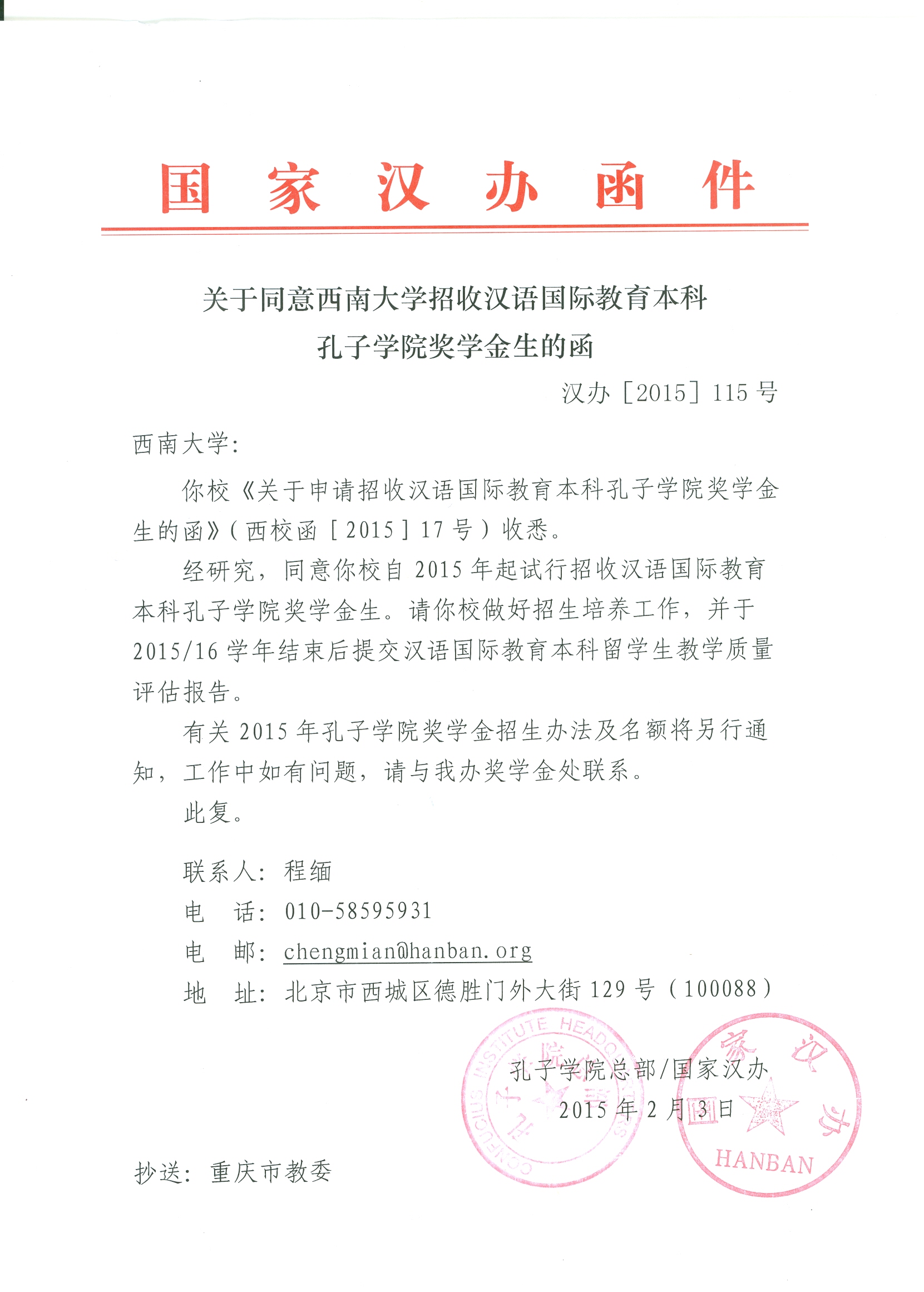 近日,国家汉办发来函件同意我校自2015年起可以招收孔子学院奖学金汉语国际教育本科生,标志着我校成为西部地区第一所具有孔子学院奖学金汉语国际教育本科项目招生资格的高校。