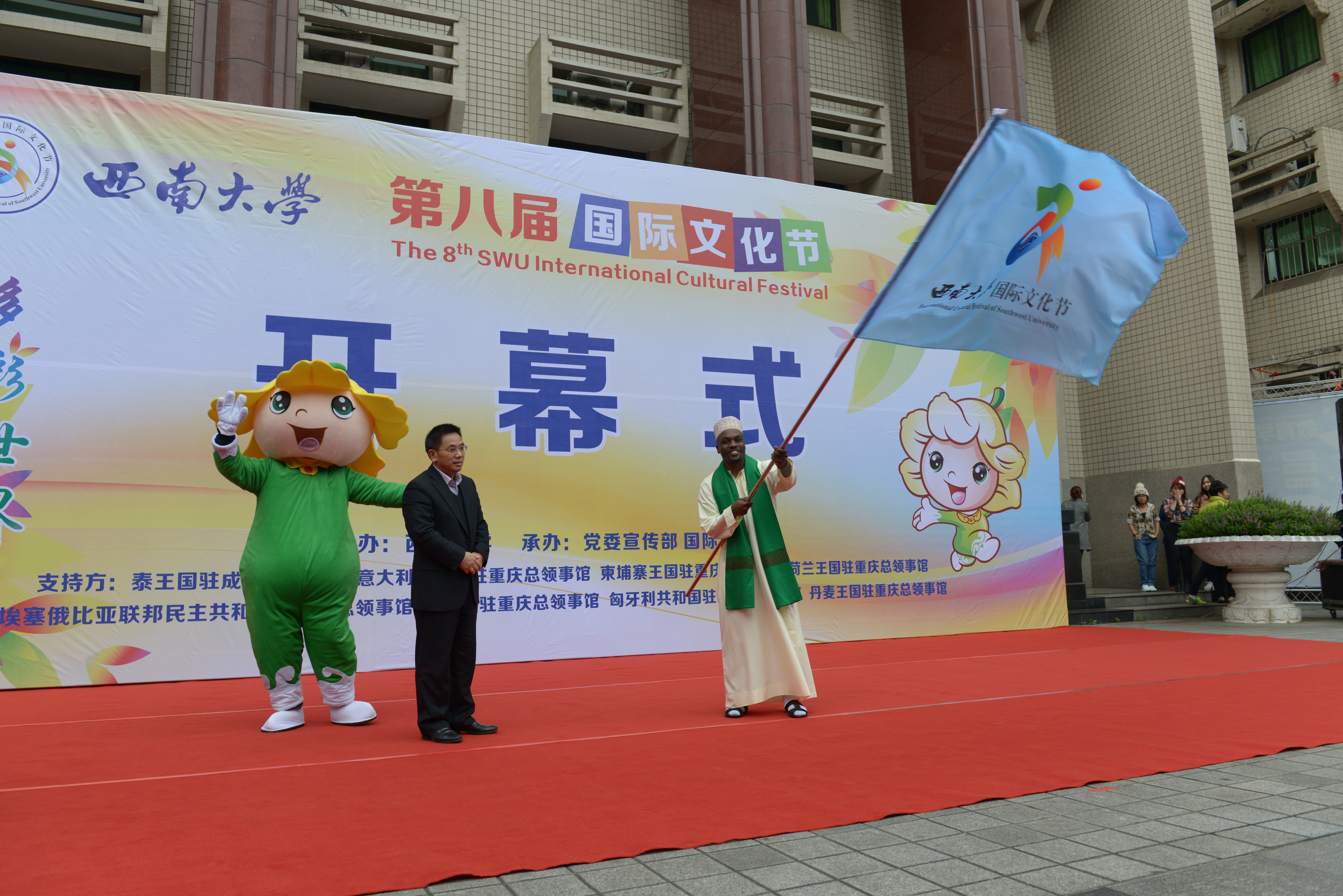 面向校内外征集文化节的主题、图标和吉祥物也在开幕式上正式启用,陈时见副校长从吉祥物“兰兰”的手中接过会旗,并将会旗授给校留学生会主席、来自坦桑尼亚的阿普杜同学,随后宣布本届国际文化节正式开幕。