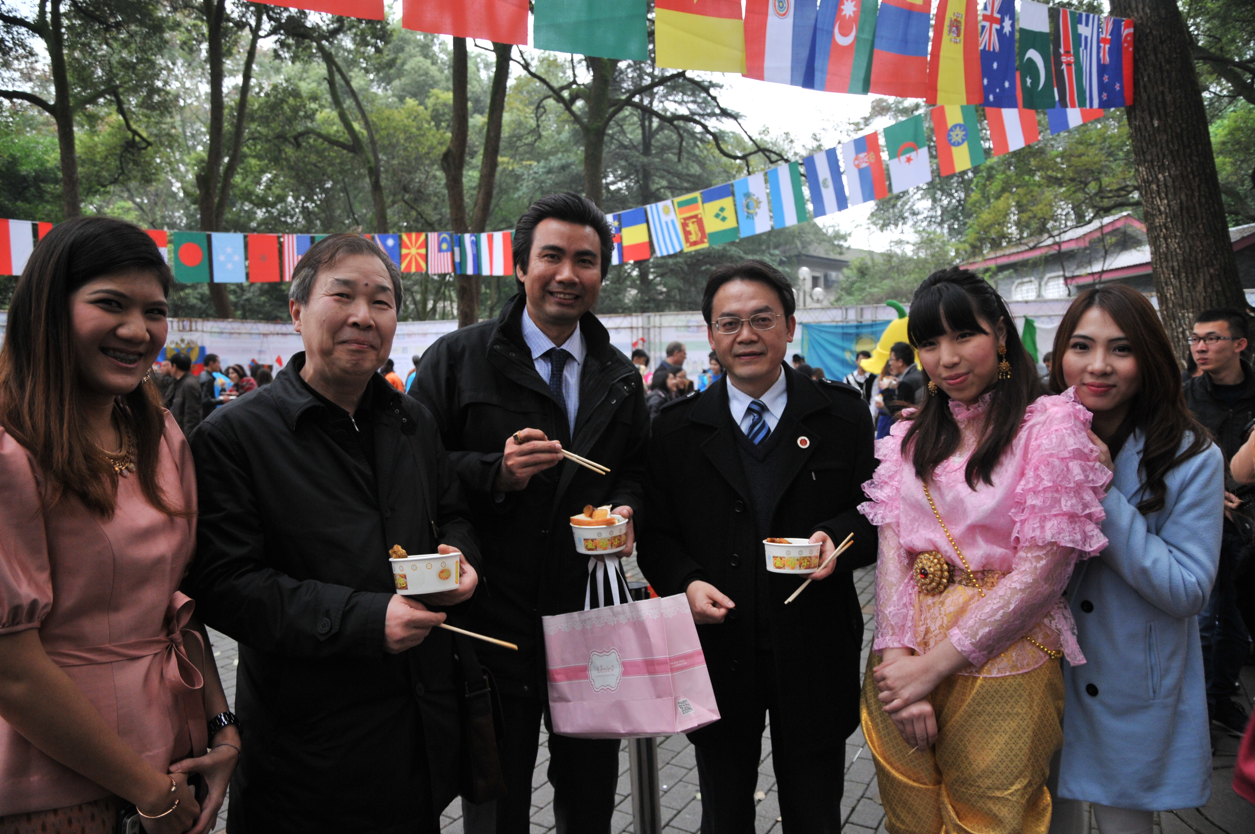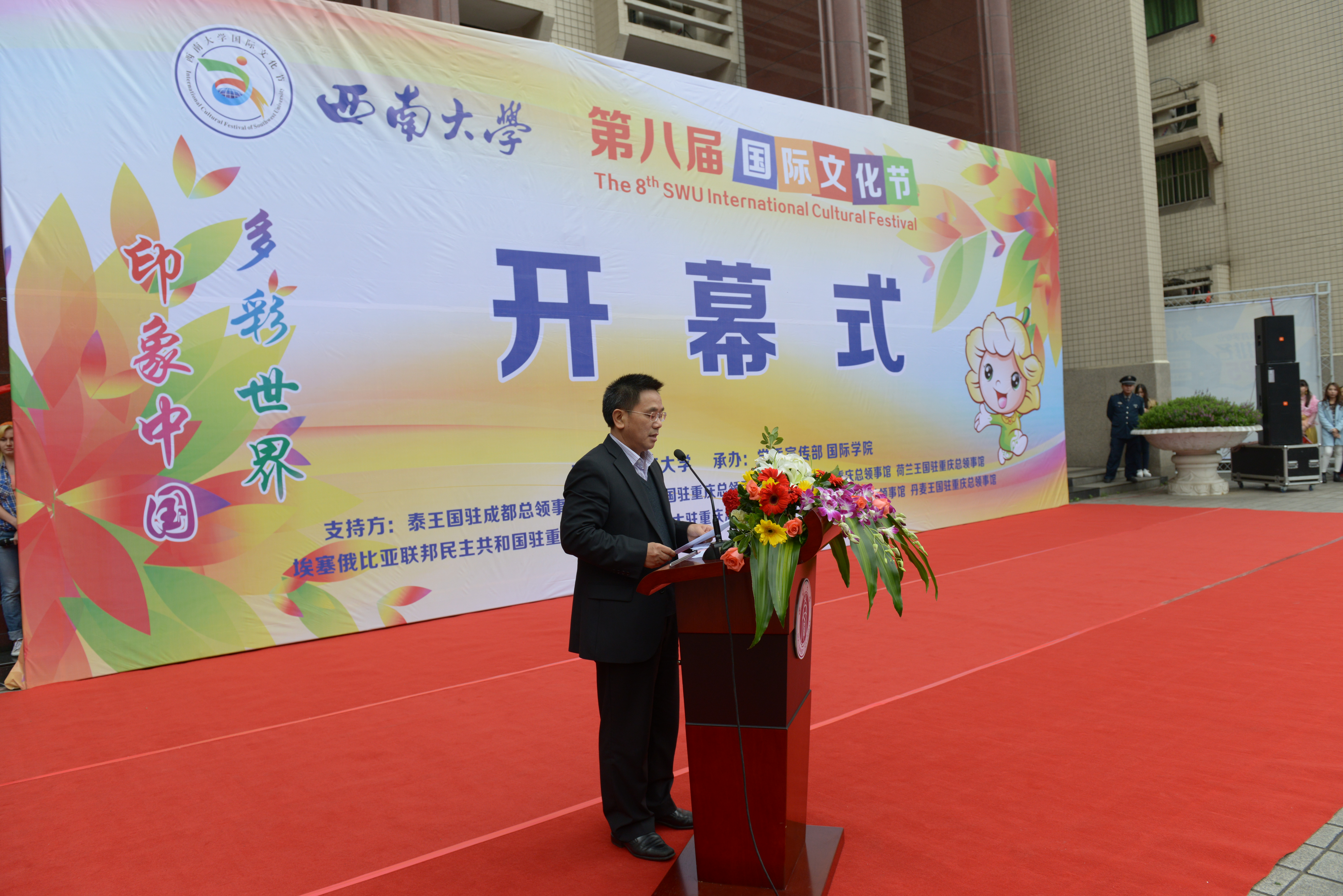印象中国 多彩世界。11月20日下午,第八届国际文化节在融汇广场如期开幕。泰国驻成都总领事馆总领事郭梅特先生、副总领事巴诺特·克雅特功先生,柬埔寨驻重庆总领事馆娄西伦领事,市教委、市外侨办、市公安局出入境管理局和北碚区公安分局有关领导,我校副校长陈时见和学校相关职能部门负责人出席开幕式。