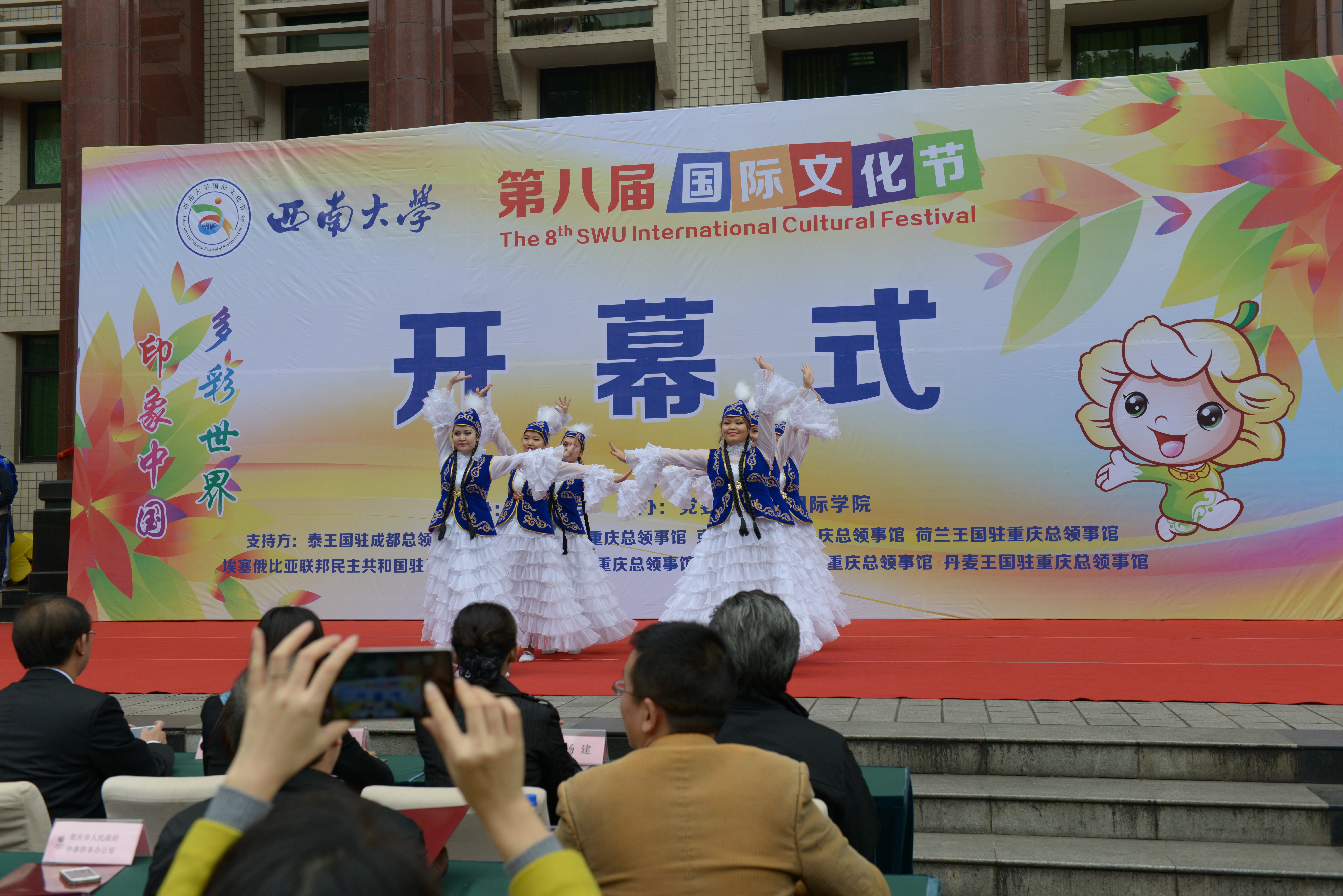 六名哈萨克斯坦留学生身着华衣翩翩起舞,用曼妙的舞姿迎接到场的观众。文化节在一段哈萨克斯坦的传统舞蹈中开场。陈时见副校长致开幕辞,认为,国际文化节的举办不仅为各国留学生提供了展示国际风采的平台,更可以让中国同学可以不出西大也能了解世界。