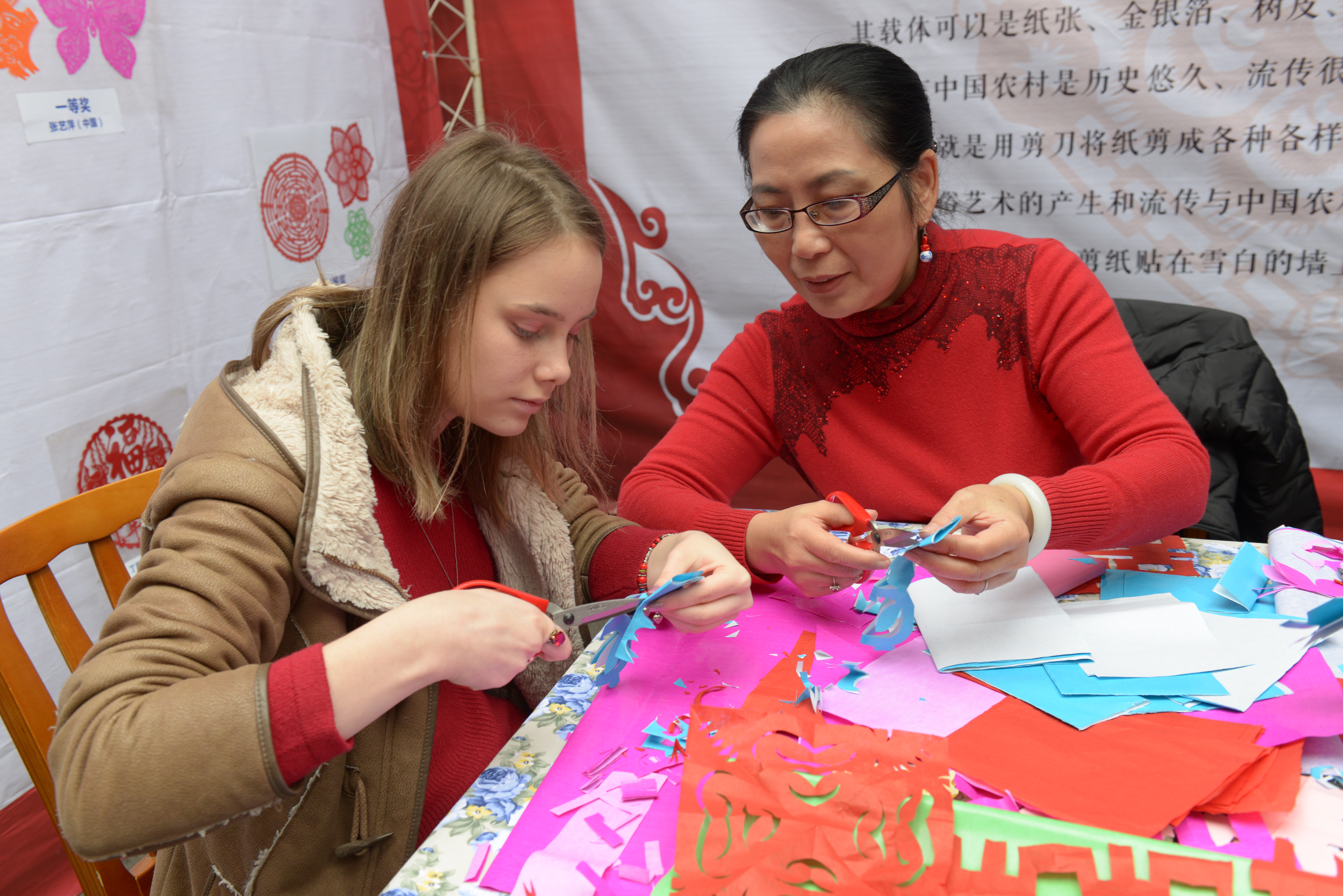 开幕式结束后,与会嘉宾和现场观众来到中华才艺展示区欣赏留学生的摄影、茶艺、剪纸、书法等才艺。摄影展分为自然风景、建筑人文、人物特写、动植物特写等4个单元,勾勒出留学生眼中美丽的中国。一旁,金发碧眼的留学生身着汉服抚琴泡茶,进行茶艺表演,旁边是剪纸和书法表演,著名剪纸艺术家梁世惠老师也来到进行现场表演和教学。一幅幅灵动的剪纸作品在梁世惠老师的手下诞生。两个来自泰国的留学生还在现场手把手地教观众剪纸。