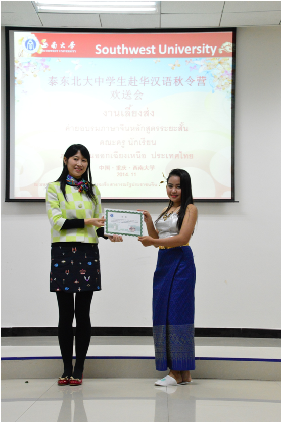 随后泰国同学们表演了节目《中文歌曲——老鼠爱大米》、《泰国风情——泰国四部舞蹈》、《现代广场舞——小苹果》,在展现泰国文化和青春个性的同时也表达了对必赢776net和对重庆的依依不舍之情。最后,王院长和陈主任分别为师生们颁发了结业证书,欢送会在活泼热烈的氛围中圆满结束。
