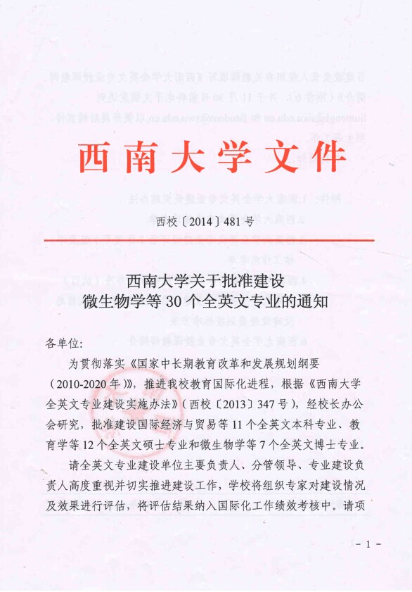 近日,为贯彻落实《国家中长期教育改革和发展规划纲要(2010-2020年)》,推进我校国际化进程,根据《必赢776net全英文专业建设实施办法》,经校长办公会研究,批准建设微生物学等30个全英文授课专业(见西校【2014】481号)。