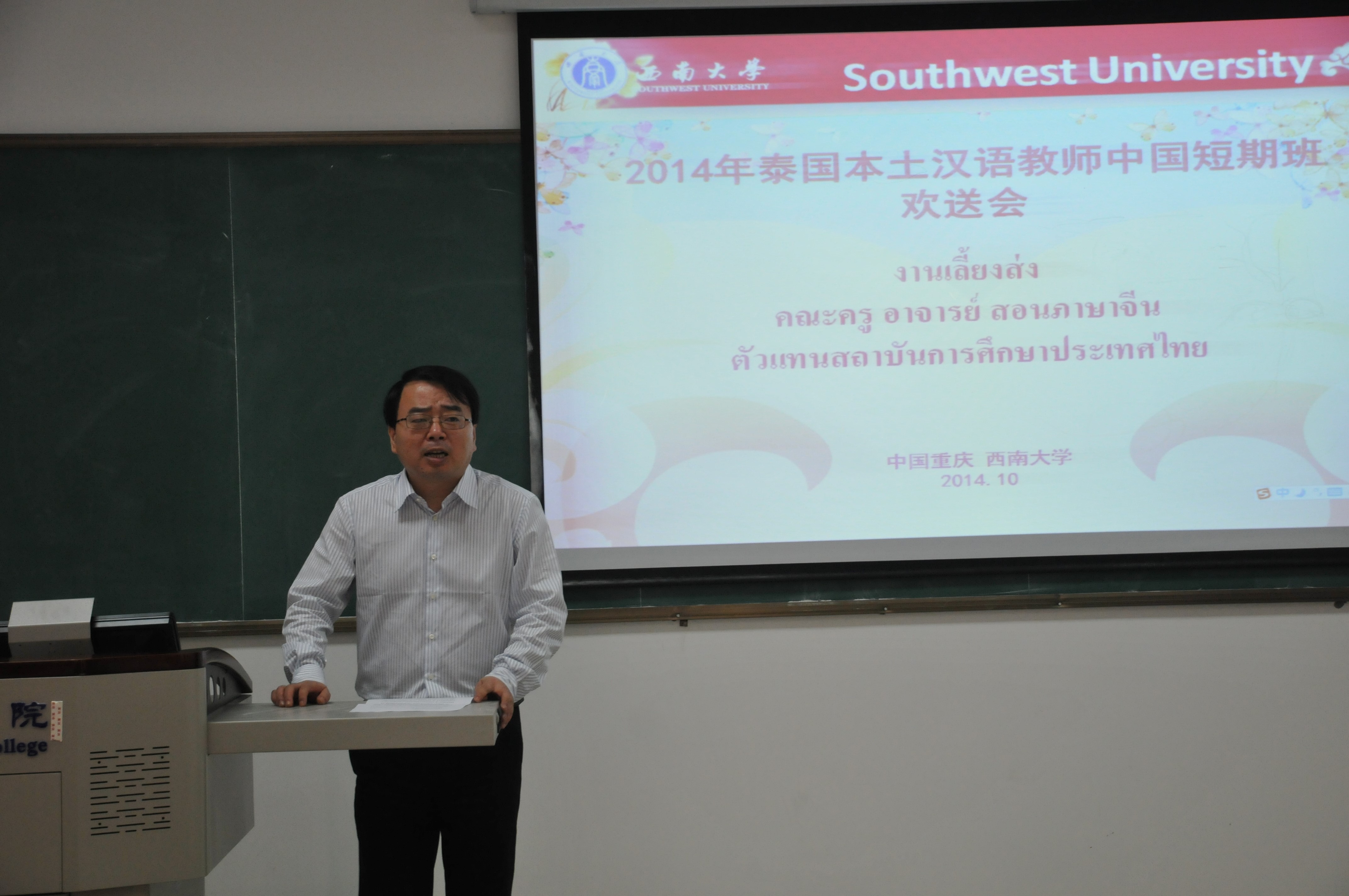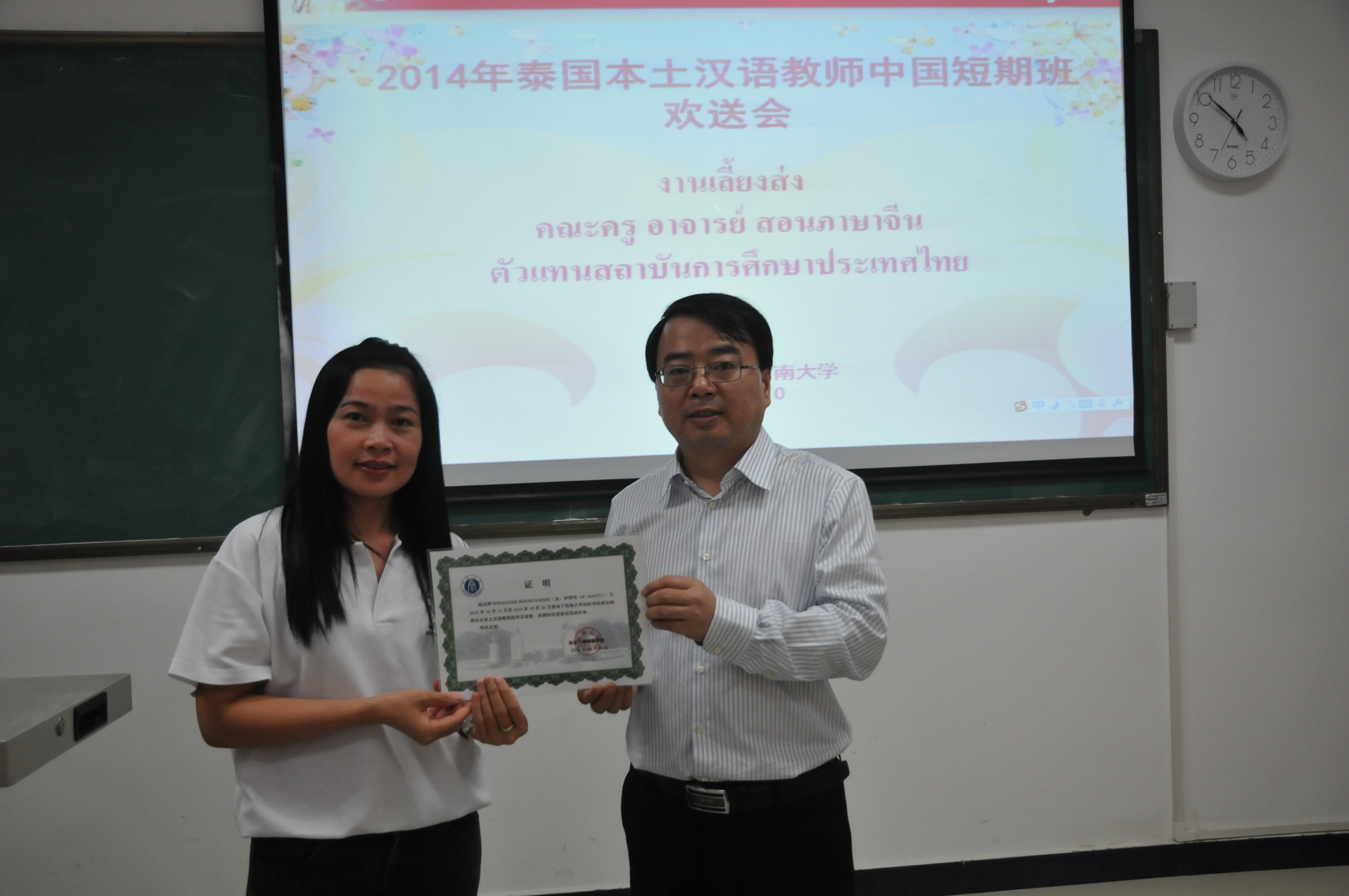 10月25日下午四点半,2014年泰东北本土汉语教师赴华汉语秋令营欢送会在必赢776net紫云楼210室举行。必赢776net副院长张家政以及来自泰国的20名本土汉语教师参加了此次欢送会。