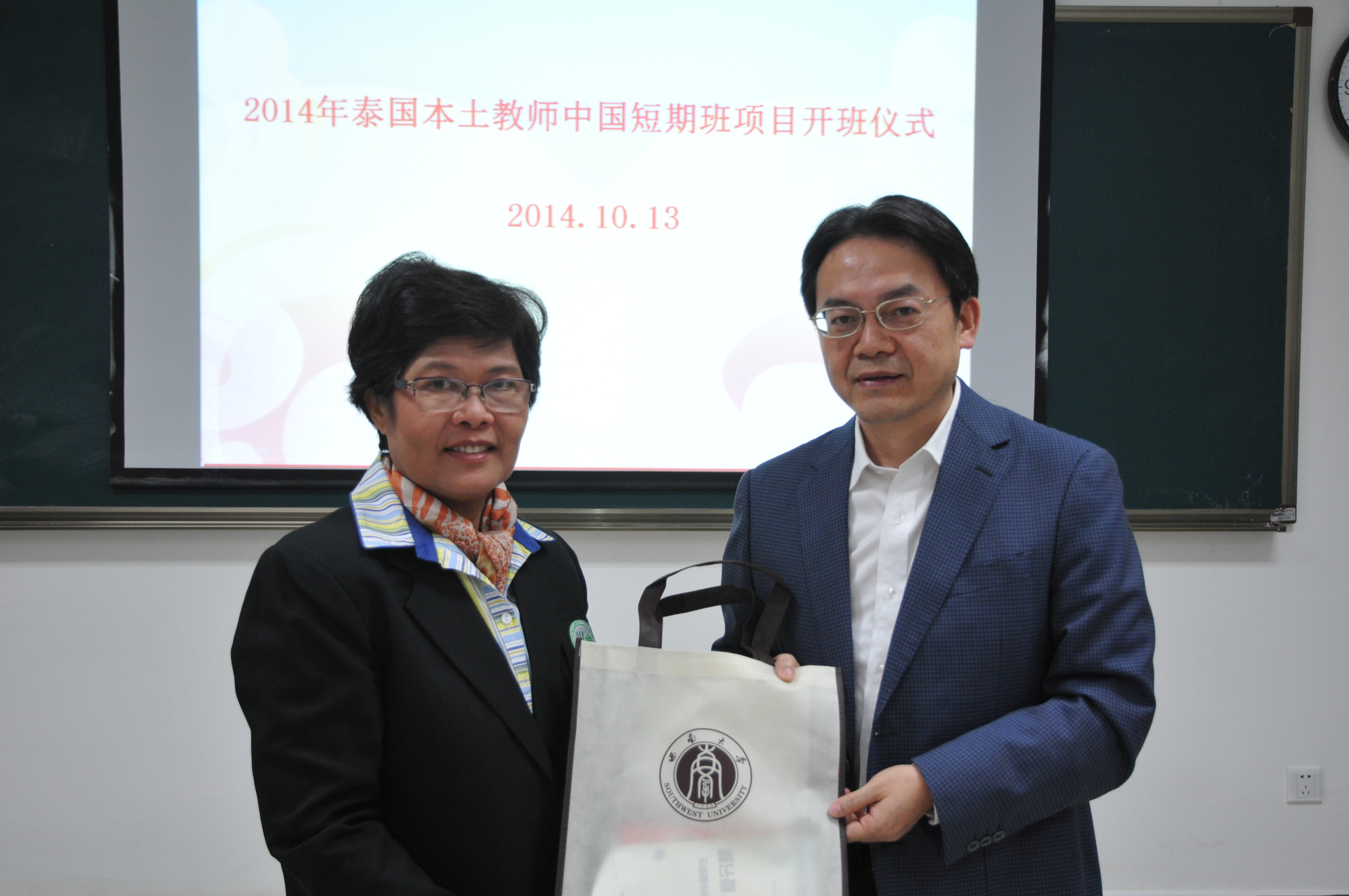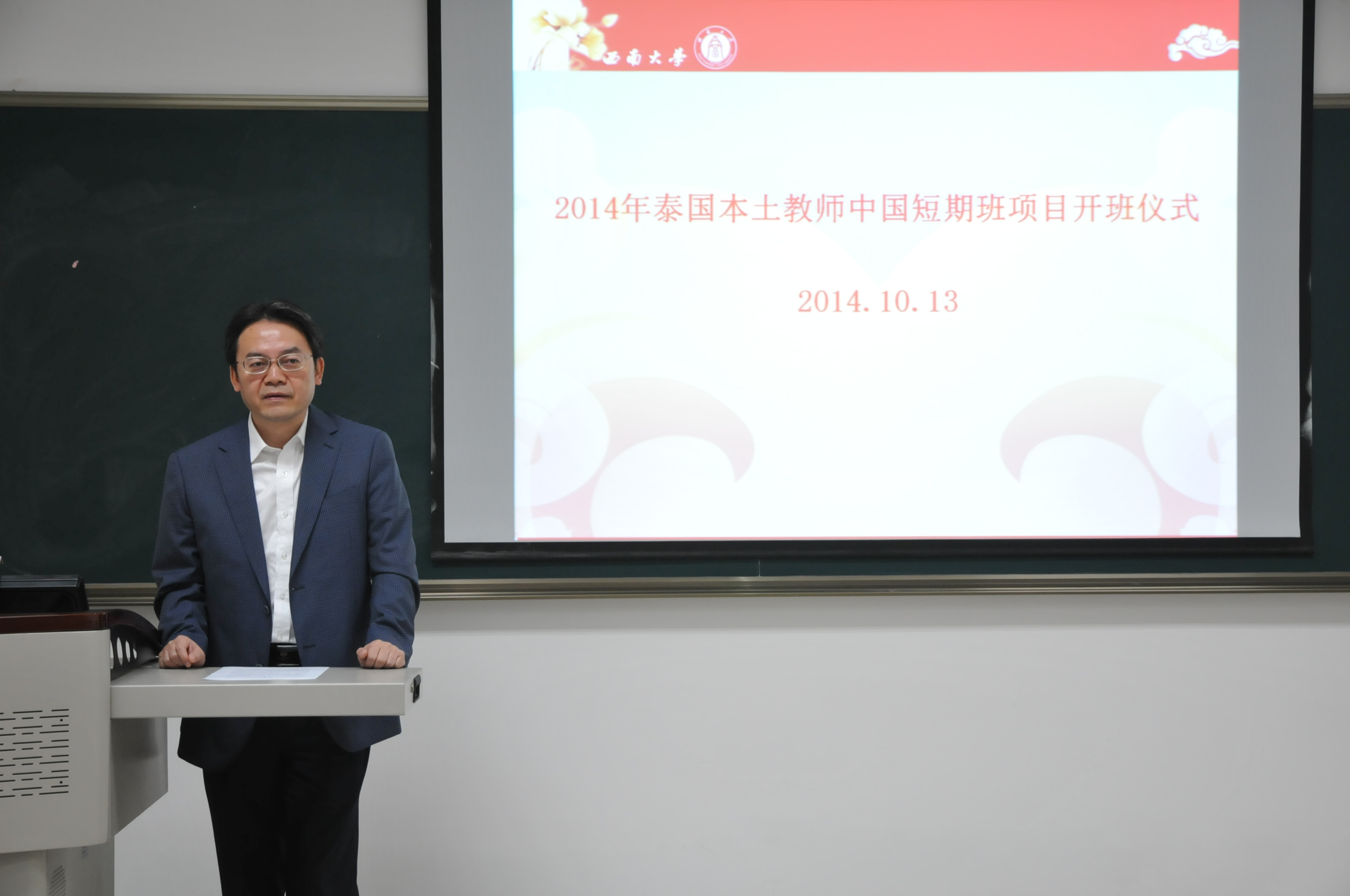 10月13日上午9点,由孔子学院资助的2014年泰东北本土汉语教师赴华汉语秋令营开营仪式在必赢776net紫云楼312室举行。必赢776net党总支书记兼副院长刘猛,泰国孔敬大学孔子学院泰方院长姚婉娜,必赢776net招生办公室主任代远鸿,以及20名来自泰国的汉语教师参加开营典礼。