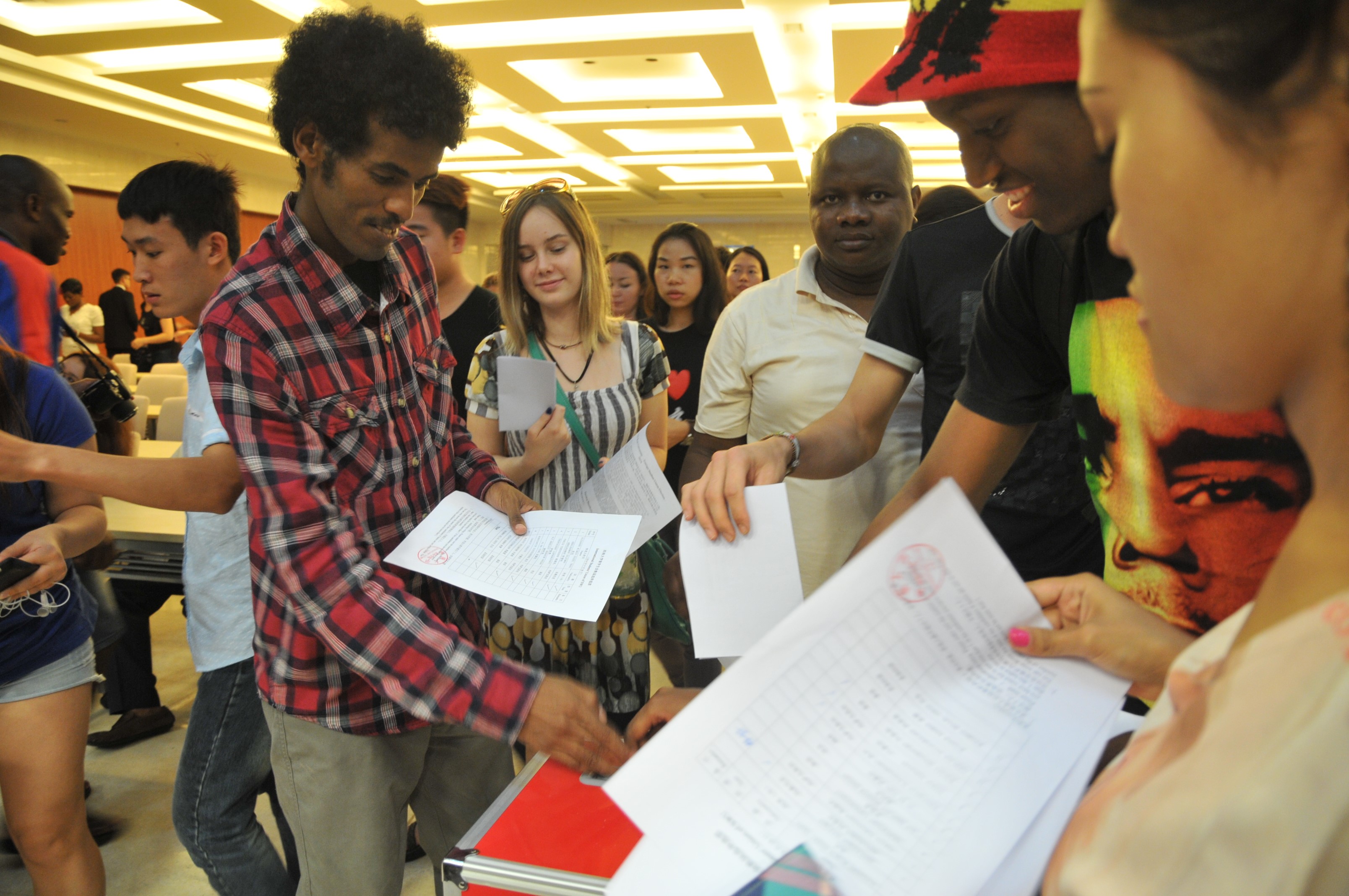 在主持人简单介绍了选举规则和投票方法之后,竞选演讲正式开始。来自6个国家的12位不同国籍的竞选人依次上台发表演说,有的慷慨激昂,有的诙谐幽默,博得台下留学生们阵阵欢呼。所有演讲结束之后,在现场工作人员的组织下,到场的留学生们依次投下自己神圣的一票。最后,到会领导、竞选同学以及大会工作人员合影留念,选举大会圆满结束。