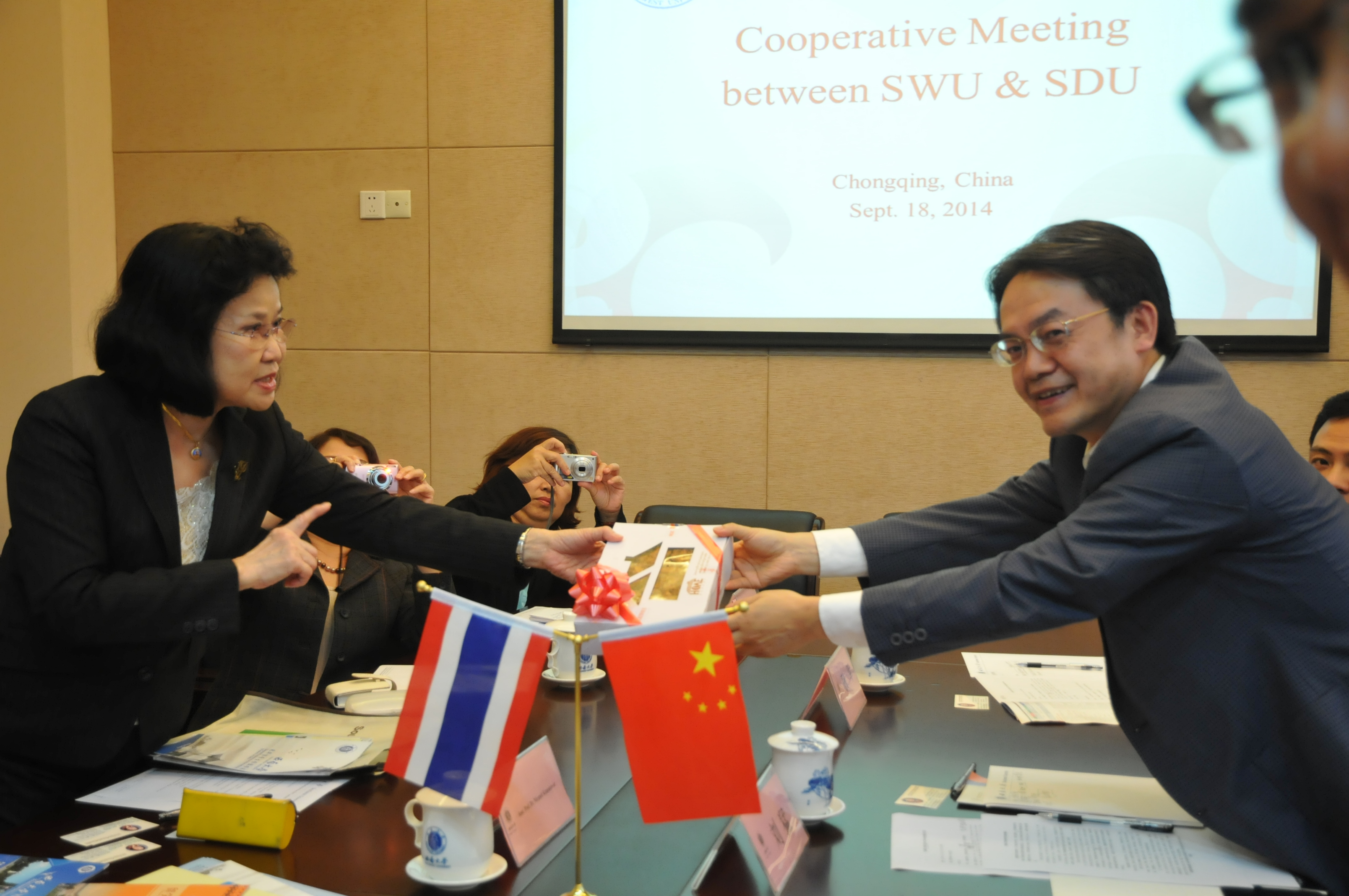 双方介绍了各自办学的情况,就派出汉硕生赴泰实习和接收泰国教师来校任教达成共识,并重点就川登喜皇家大学汉语专业学生参加“2+1+1”学分项目做了深入研讨。会谈结束后,中泰双方互赠礼品并合影留念。