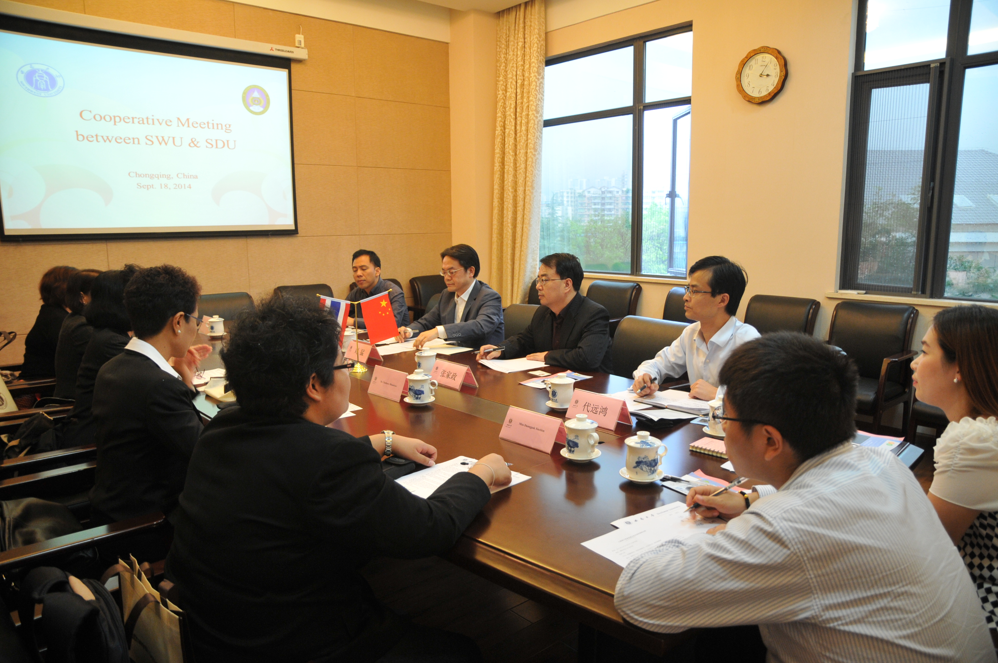2014年9月18日泰国川登喜皇家大学Niramit副校长一行到访我院,洽谈合作事宜。学院党总支书记兼副院长刘猛,副院长张家政,招生办公室主任代远鸿,汉教系主任耿军参加会谈。