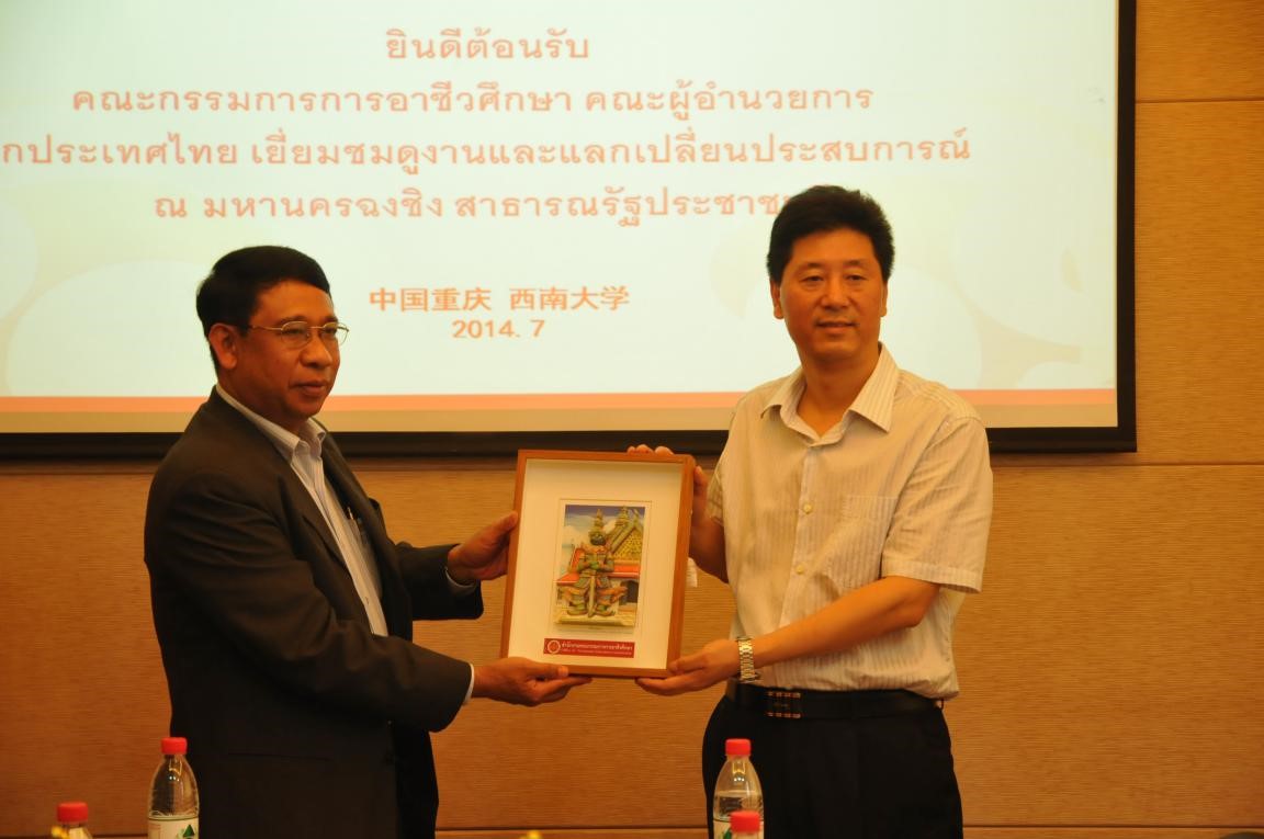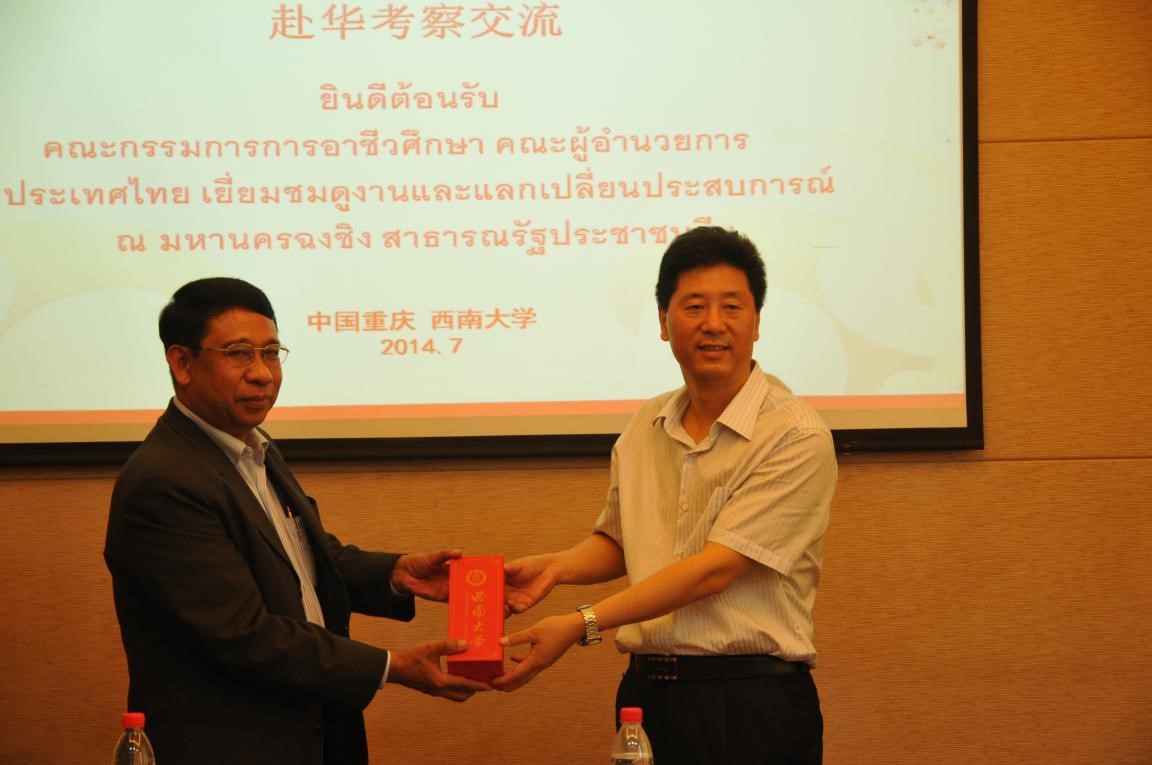靳玉乐副校长与泰方代表Parchakhom Chantharachit博士互赠纪念品并合影留念。