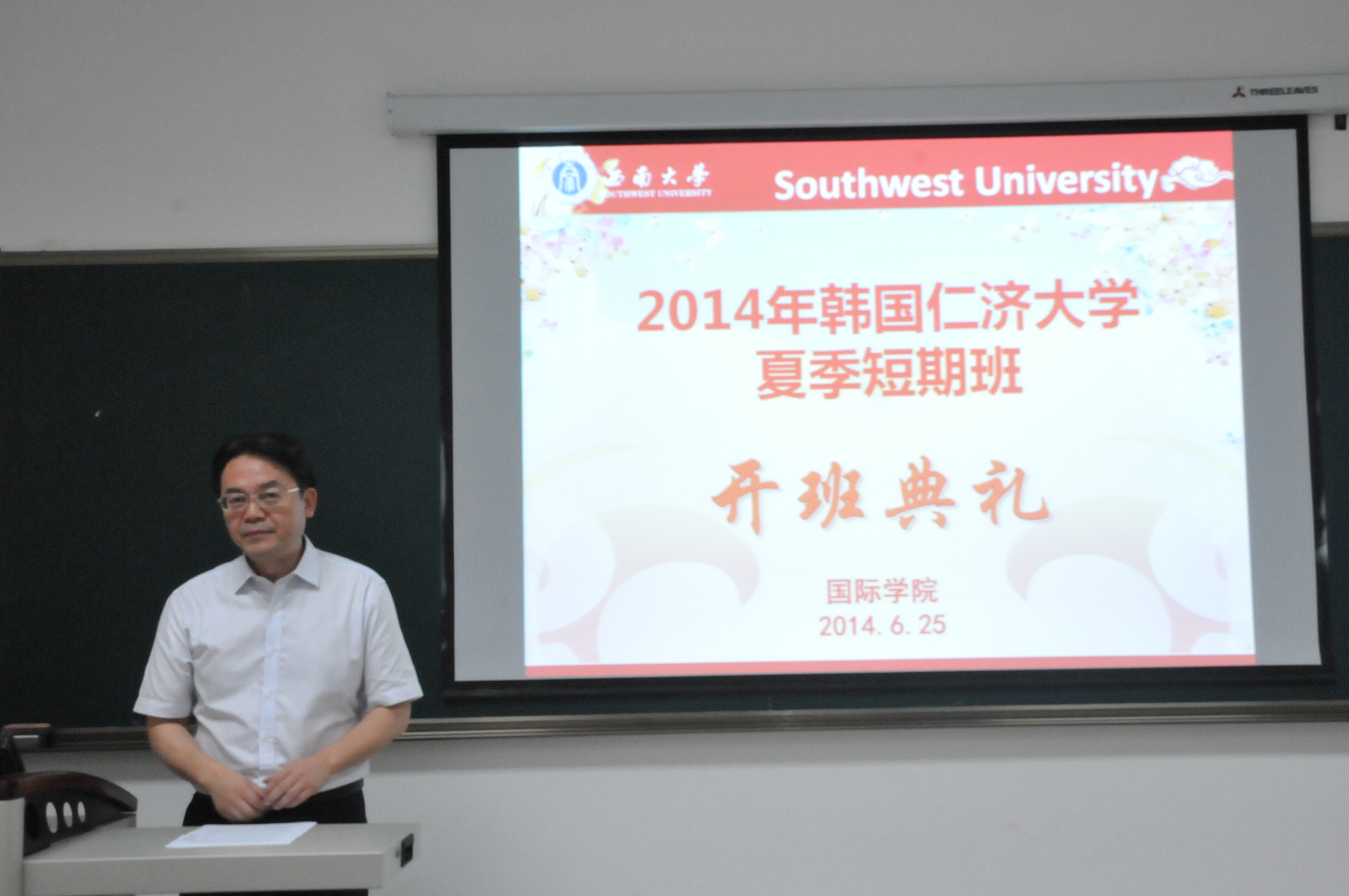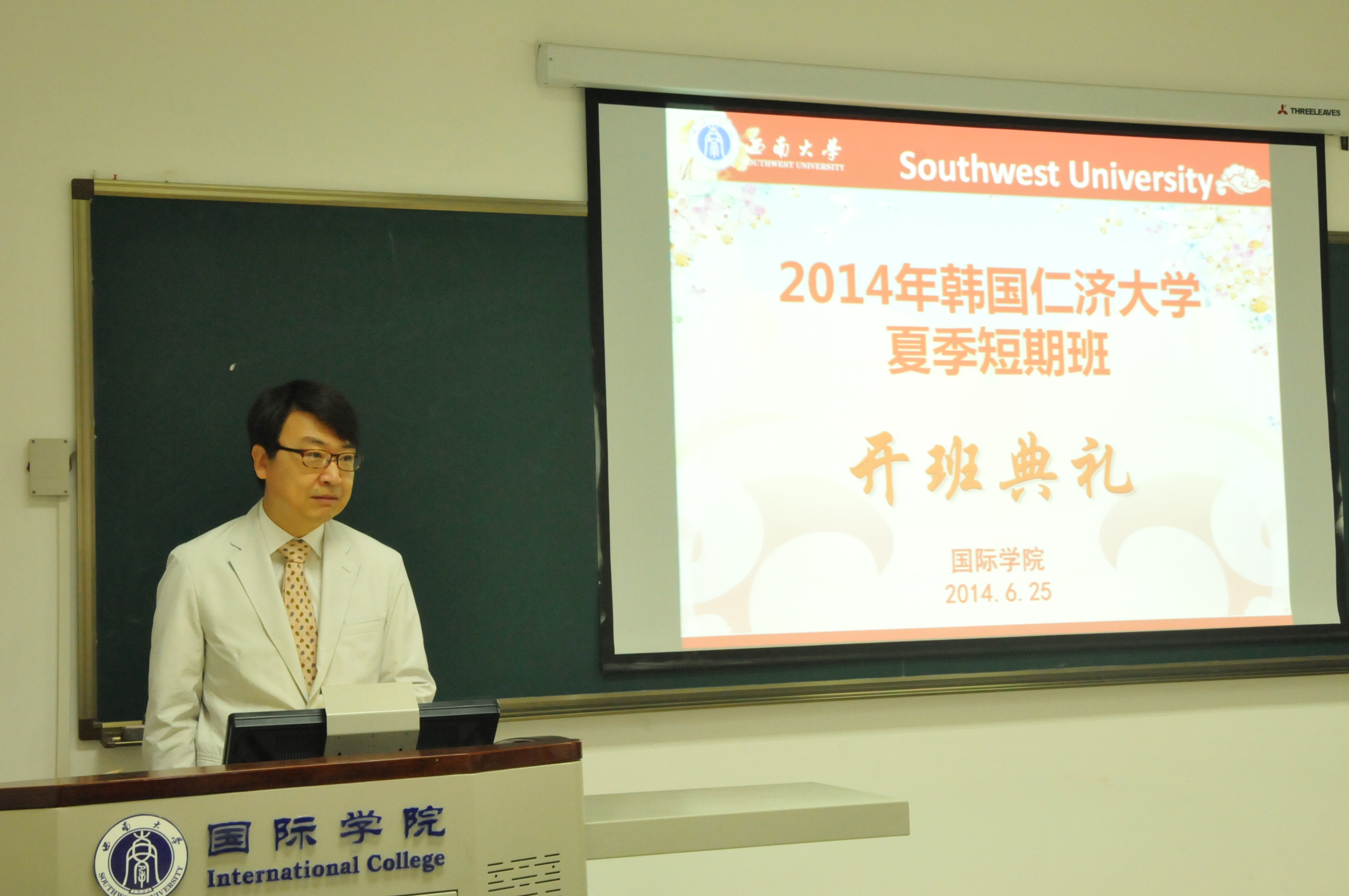6月25日上午,2014年韩国仁济大学暑期班开班典礼在必赢776net312教室隆重举行。必赢776net党总支书记兼副院长刘猛、副院长张家政、韩国仁济大学国际交流处处长朴载燮,必赢776net部门负责人,19名韩国学生以及中国语伴代表参加开班仪式。