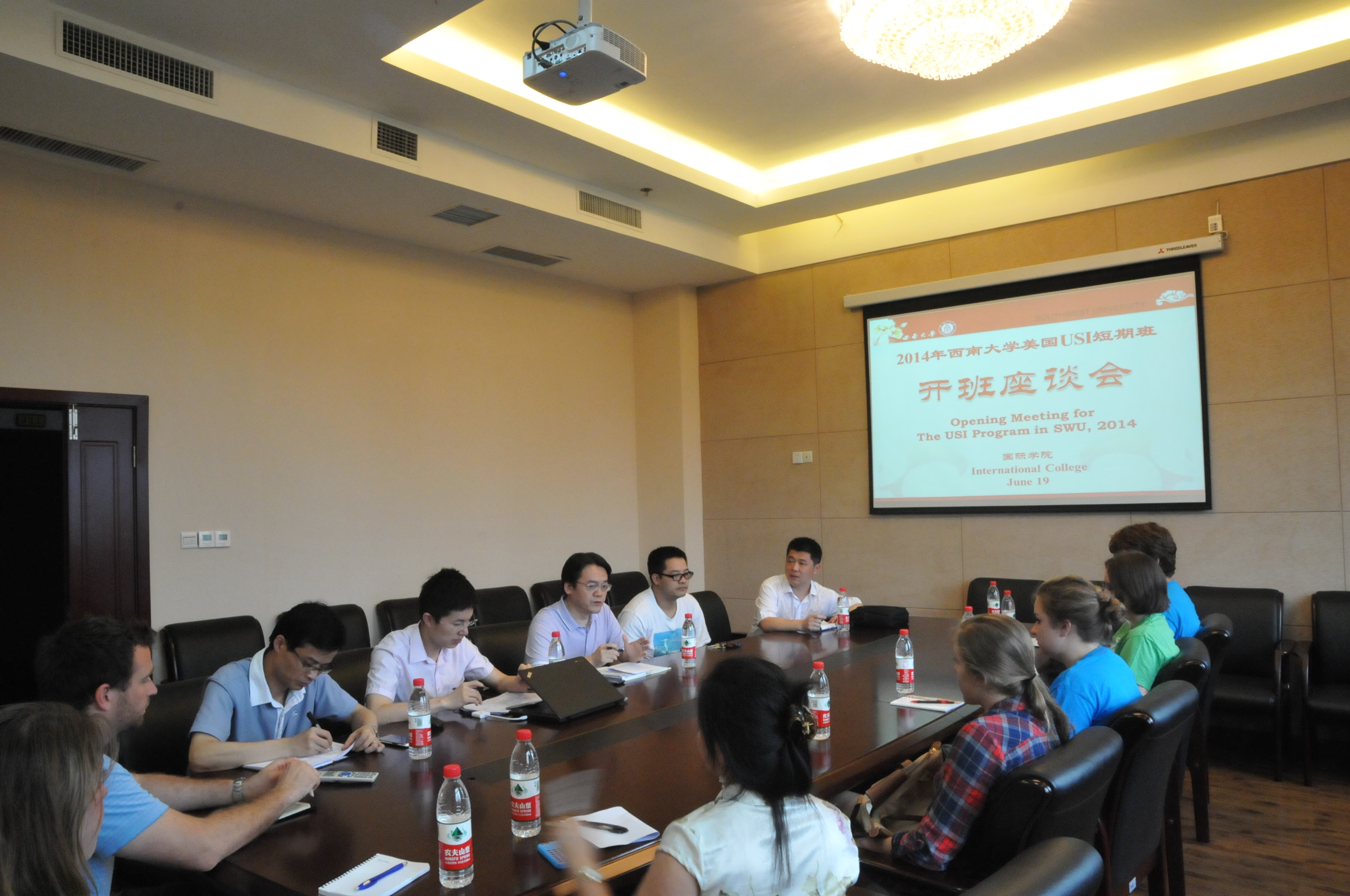 6月19日,必赢776net在紫云楼310会议室举行了简朴热烈的美国南印第安纳大学(USI)暑期项目开班仪式。副院长刘猛,招生办主任代远鸿、教师代表王勇、黎力, USI项目带队老师庞琳以及全体留学生、中国语伴志愿者参加了开班仪式,仪式由该班班主任李林泽主持。