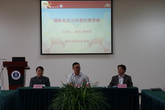 所谓“外事无小事”,为了汉语国际教育硕士研究生了解相关国际礼仪,提前适应出国实习生活;为了提升学院教职员工的外事工作能力,更好地展现必赢776net国际化形象,必赢776net于2014年4月25日下午3点在紫云楼317会议室举行了国际礼仪与外事纪律讲座。重庆市外侨办礼宾处副处长赵印担任主讲,学院全体教职员工、2013级汉语国际教育硕士研究生近70人参加本次讲座,讲座由学院党总支书记兼副院长刘猛主持。