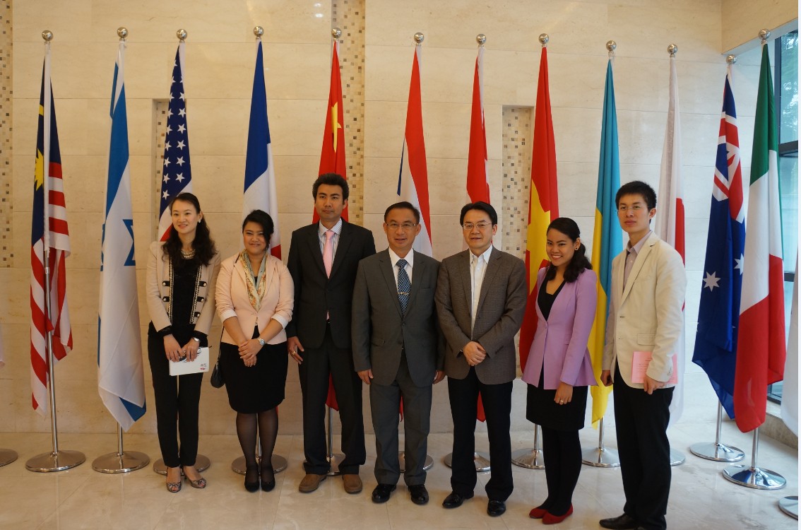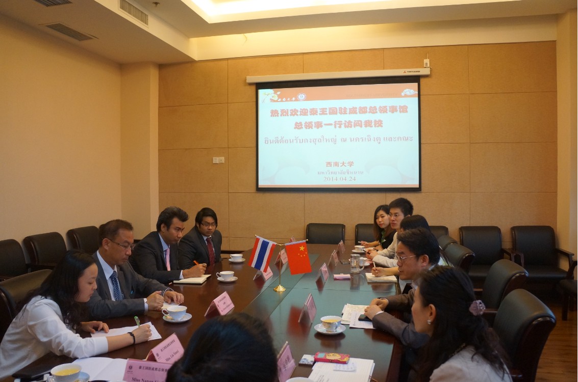 4月24日,泰王国驻成都总领事馆总领事Komate Kamalanavin先生,副总领事Panot Kiatkong等一行7人访问我校必赢776net,学院总支书记兼副院长刘猛接待了来宾并就总领事馆在我院建立泰国风情教室举行了详细会谈。