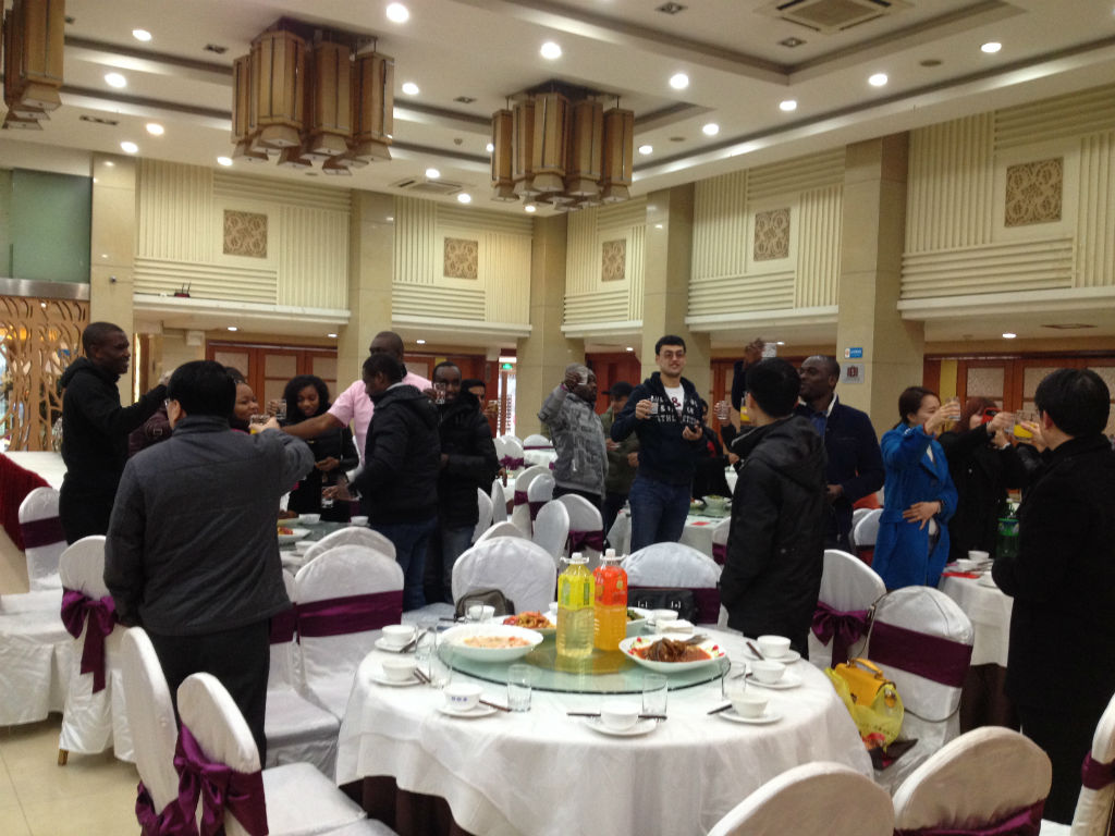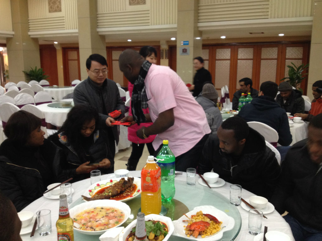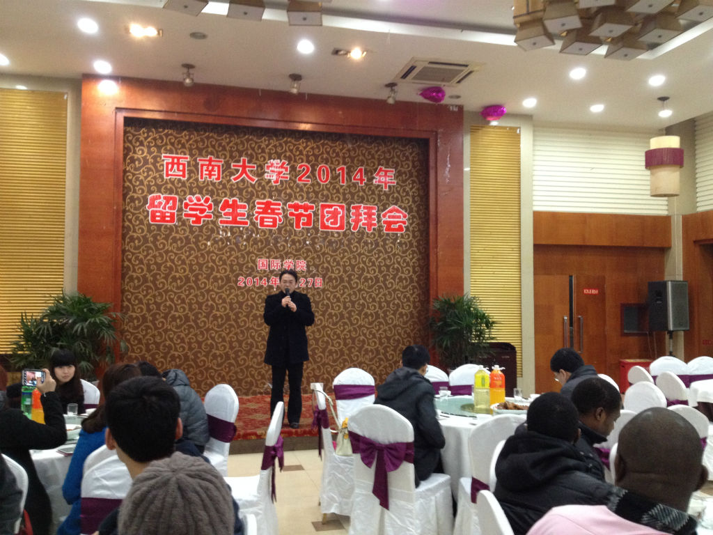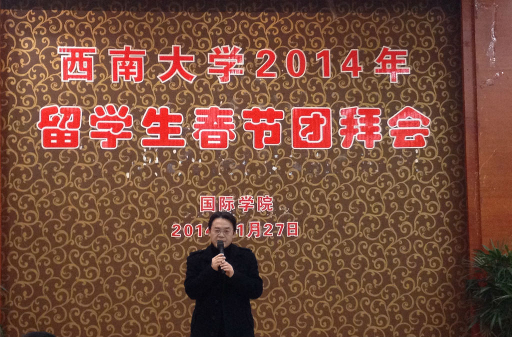 刘猛书记首先致辞,介绍了春节的传统习俗,回顾了2013年我校来华留学生教育的发展及所取得的成绩,并鼓励大家要发扬马的精神,一马当先,马不停蹄,马上拥有一切。张家政副院长随后也发表了新年祝福,祝大家马上有爱,马上有福,马到功成。来自韩国的朴秀海同学代表所有留校留学生发言,讲述了自己第一次在中国过春节的感受并为大家送上了新年祝福。刘猛书记和张家政副院长还以红包的方式向各位留学生发放了春节慰问金。团拜会上,大家举杯同贺,其乐融融,仿佛家人般相互问候,相互祝福,2014年留学生春节团拜会在一片欢声笑语中顺利结束。
