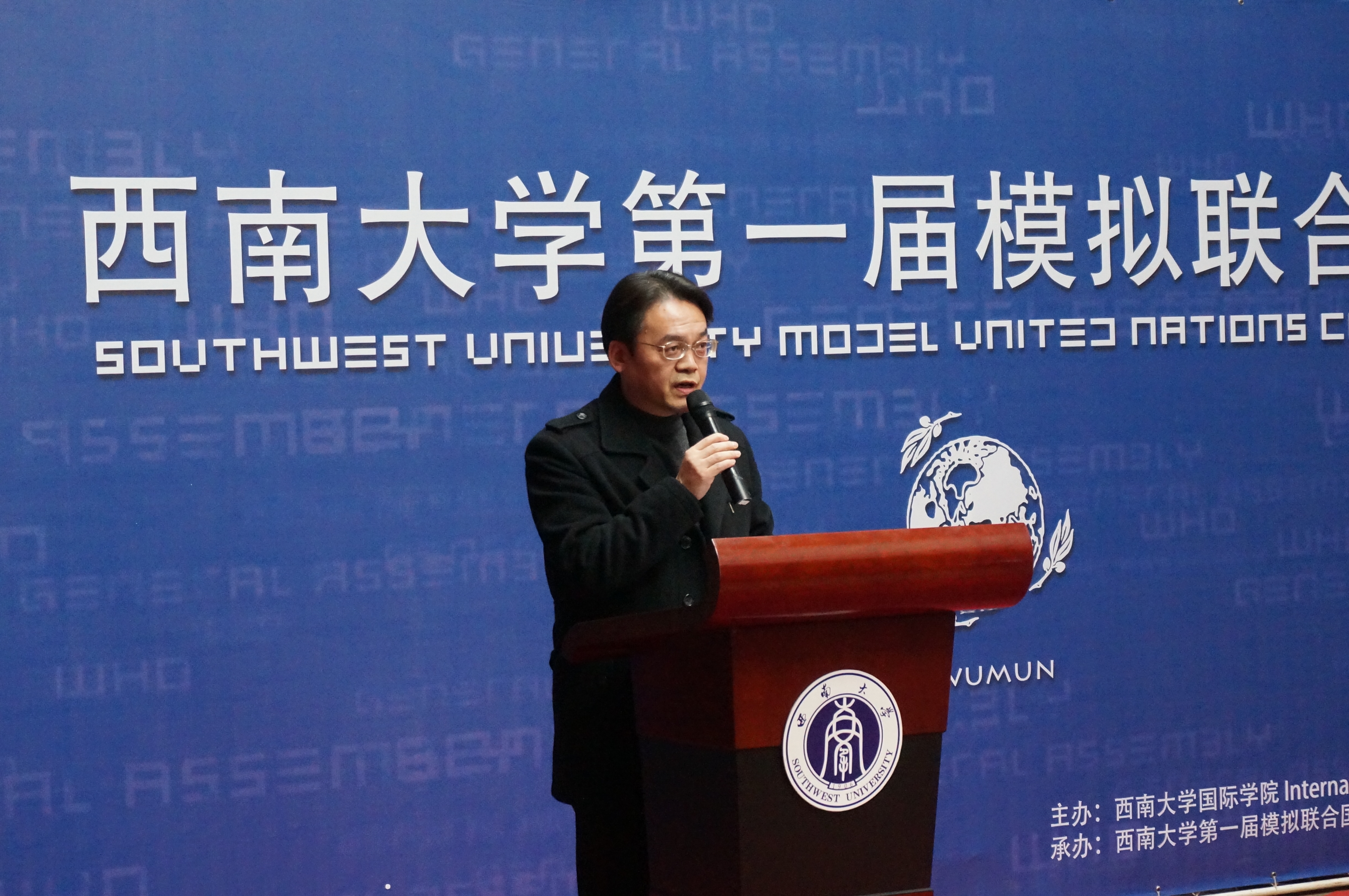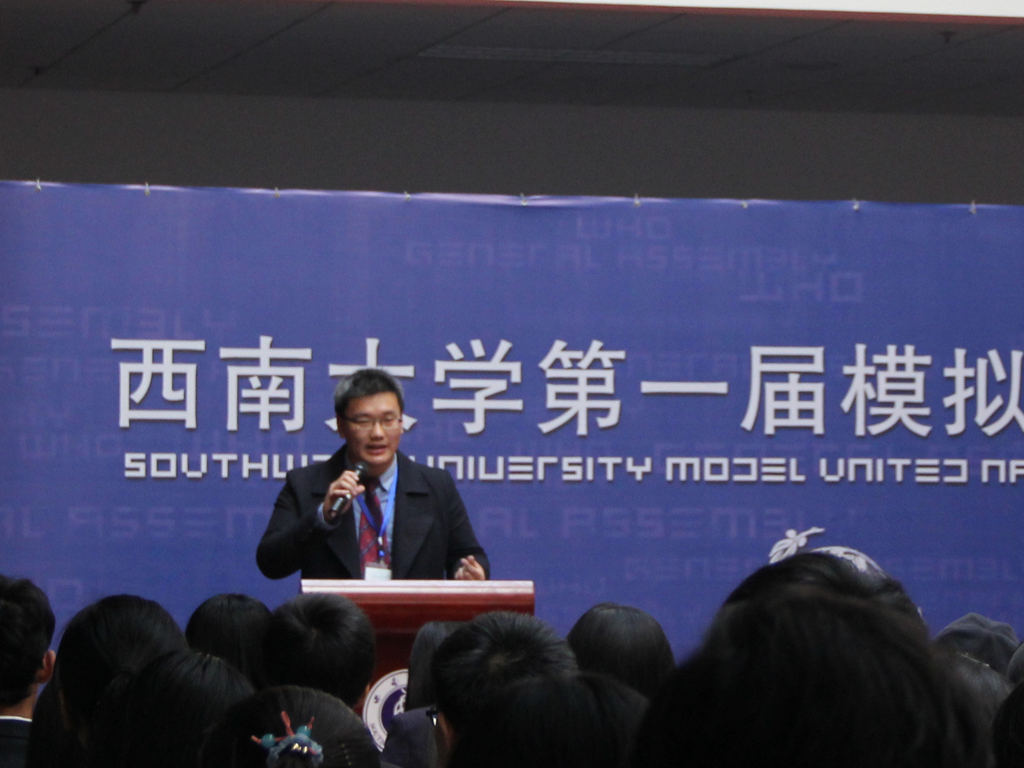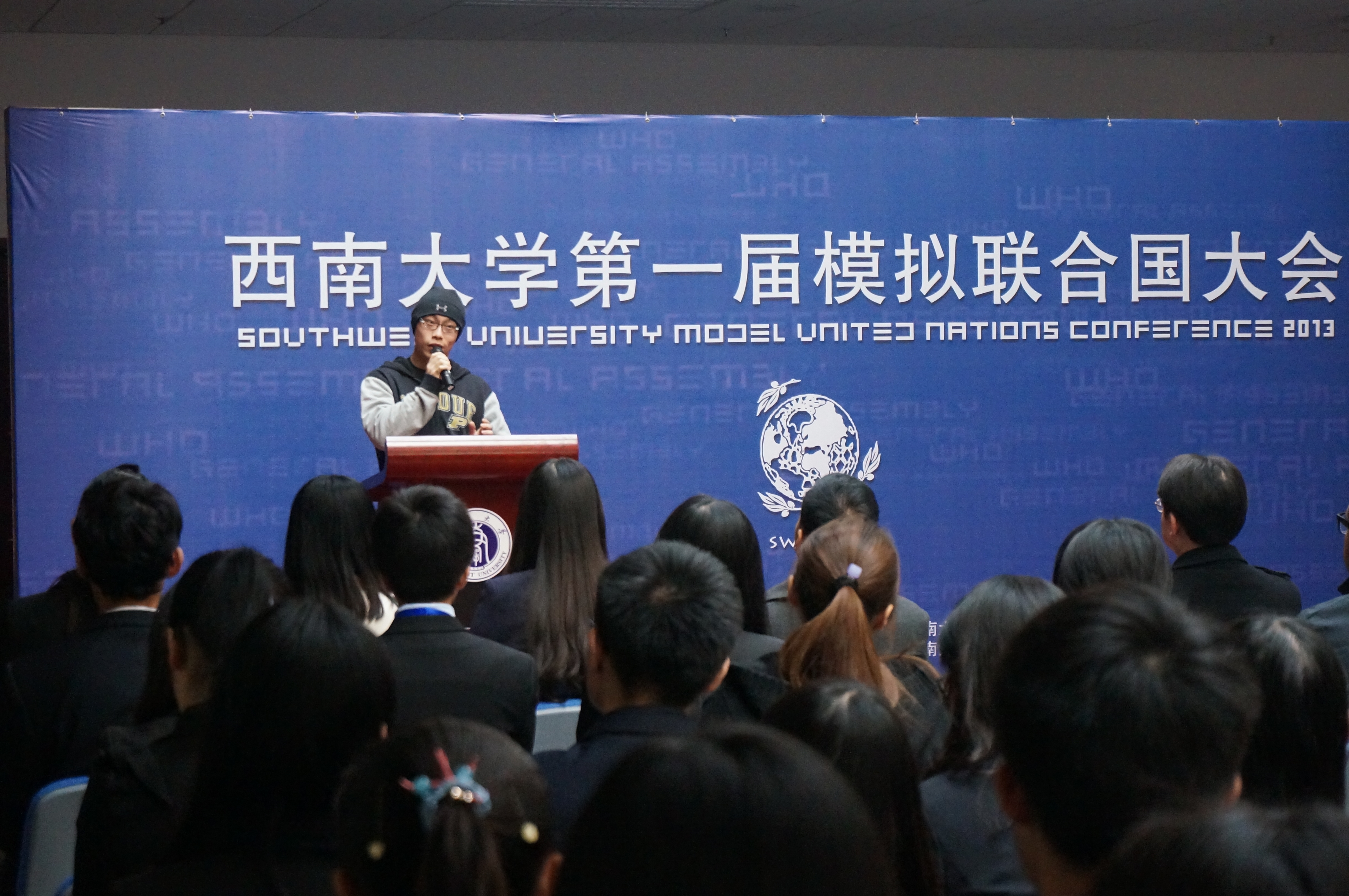 刘院长的讲话从模联对大学生的益处入手,就知识的增加和能力的提高进行了阐述,并介绍了本次大会的议题,他还对参会同学提出了殷切的希望。希望他们在两天的会议中“积极思考,畅所欲言,沟通合作,激扬风采,为世界的和平与发展贡献一份心力。用模拟的会议谱写真实蓝图。”紧接着,必赢776net第一届模拟联合国大会秘书长袁晔发表了讲话,他以全英文的形式向大家介绍了本次模拟联合国大会的主要内容,回忆了自己和模联的故事,讲述了西大模联发展的心路历程和大会筹备过程中的切身感受。最后,他对众多付出辛勤与汗水的幕后工作人员表示了衷心的感谢。