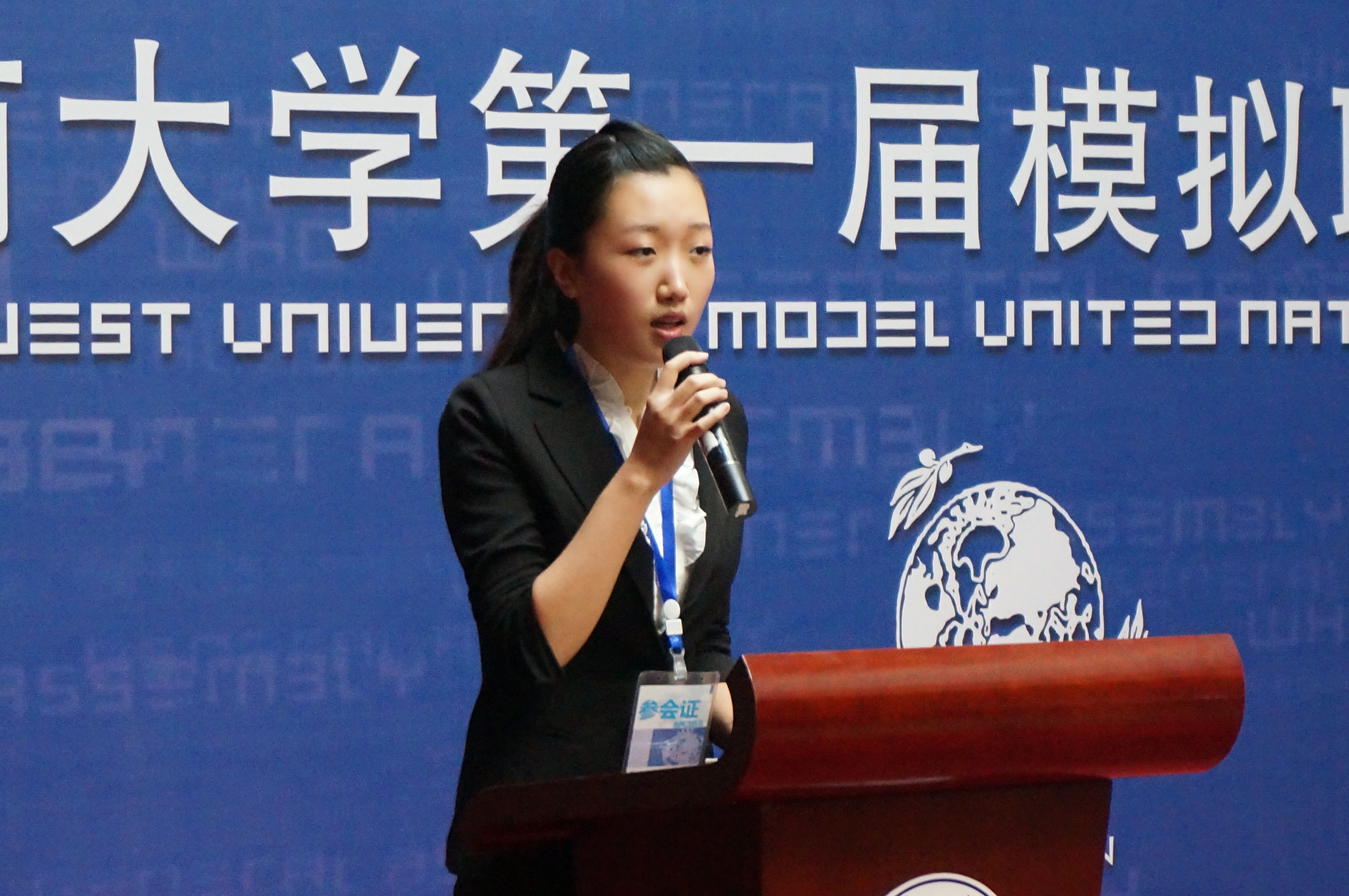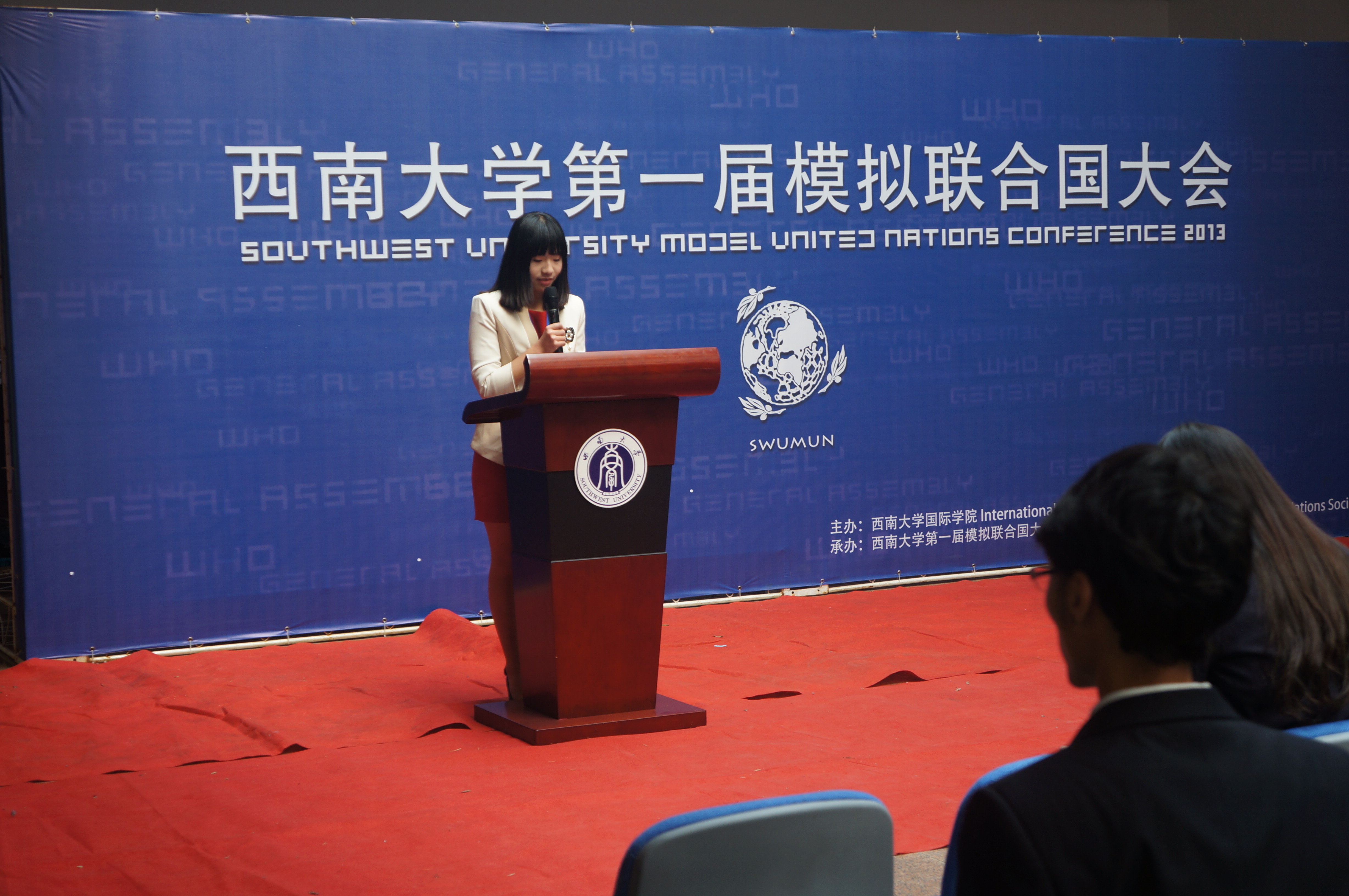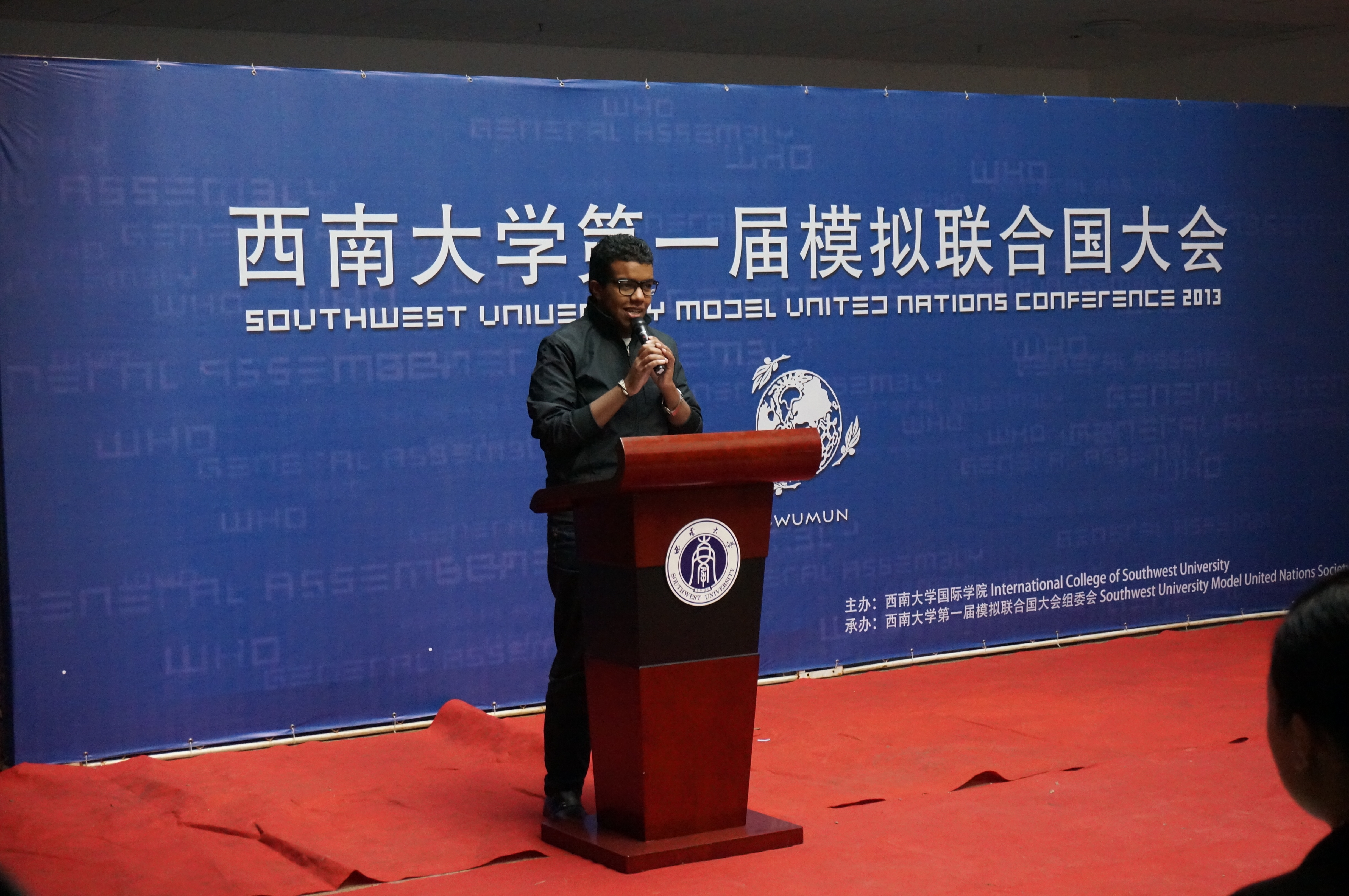 刘院长的讲话从模联对大学生的益处入手,就知识的增加和能力的提高进行了阐述,并介绍了本次大会的议题,他还对参会同学提出了殷切的希望。希望他们在两天的会议中“积极思考,畅所欲言,沟通合作,激扬风采,为世界的和平与发展贡献一份心力。用模拟的会议谱写真实蓝图。”紧接着,必赢776net第一届模拟联合国大会秘书长袁晔发表了讲话,他以全英文的形式向大家介绍了本次模拟联合国大会的主要内容,回忆了自己和模联的故事,讲述了西大模联发展的心路历程和大会筹备过程中的切身感受。最后,他对众多付出辛勤与汗水的幕后工作人员表示了衷心的感谢。