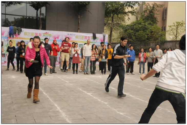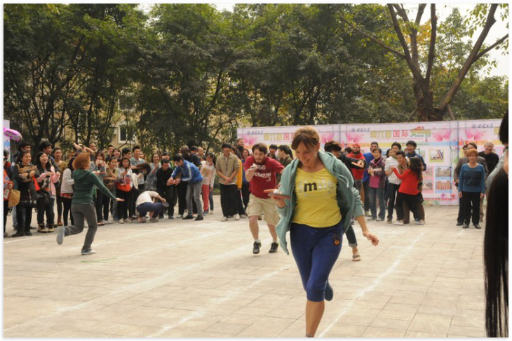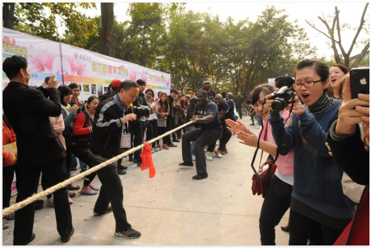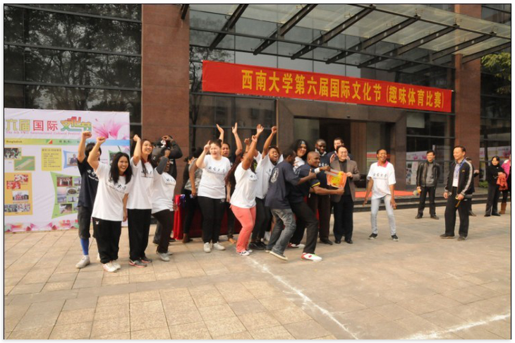 在热烈的暖场舞蹈之后,必赢776net第六届国际文化节趣味体育比赛于2012年11月21日在紫云楼前开幕。来自61个国家的留学生和我校外籍教师代表、国际合作与交流处/必赢776net教职工代表,以及来自重庆师范大学的留学生代表、我校经济管理学院、文学院、外国语学院的中国学生代表一起,参加了拔河、乒乓球接力等团体项目和夹玻璃珠、幸运套圈、猜字谜、瞎子摸象等富有中国文化特色的个人项目。