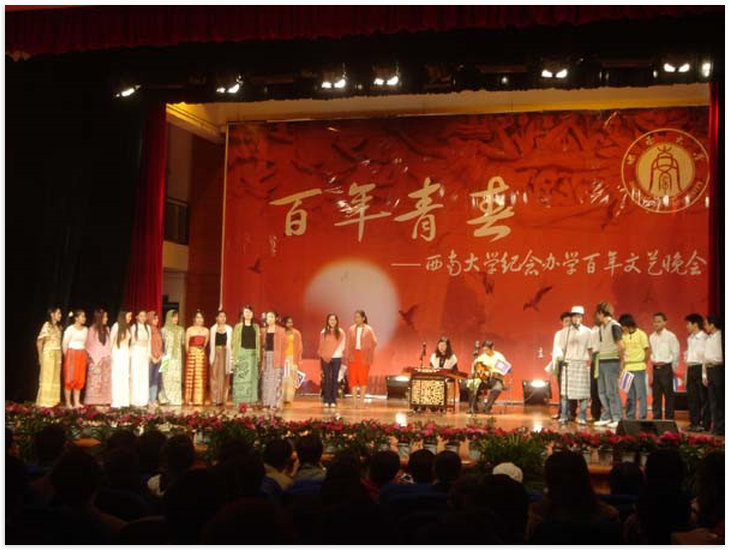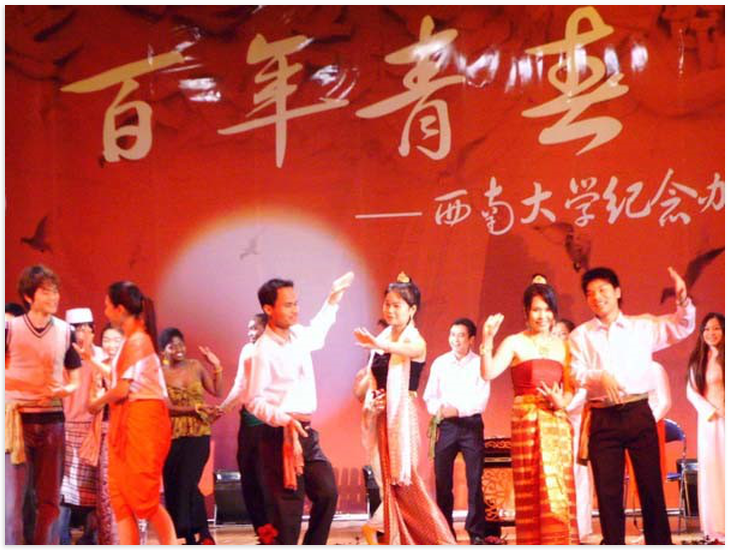 11月28日晚,我校百年校庆在如火如荼的气氛中进行。由留学生自编自导自演的歌舞剧《明月千里寄相思》被组委会选中,安排在第九个节目中出场。节目分为两部分,第一部分是所有留学生用汉语合唱《明月千里寄相思》,第二部分为泰国舞蹈《水灯节》,中间穿插了一段柬埔寨民间舞蹈,以吉他和扬琴伴奏。