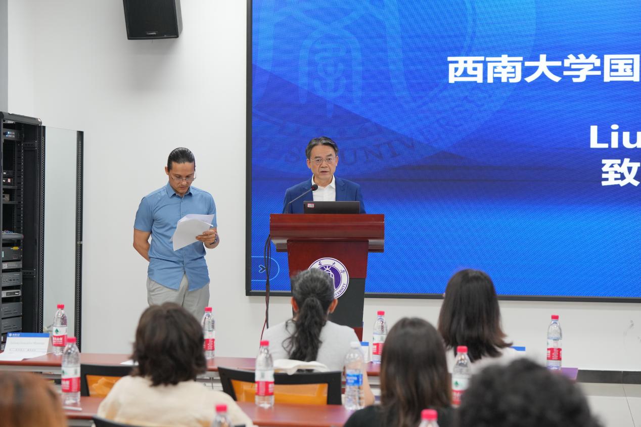 中国对外文化集团有限公司文旅板块副总经理张猛热情欢迎远道而来的哥伦比亚师生,真诚感谢学校精心细致的安排,希望同学们在美丽的大学校园里,不仅能够感受到中华文化的熏陶,汲取到知识的养分,更能够收获到满满的幸福。