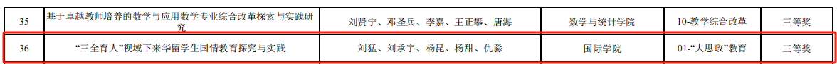 此次是学院建院以来获得的首个教学成果奖,是学院实施来华留学生中国国情教育的一次重大突破。今后,学院将进一步提高政治站位,继续做好国情教育的理论研究和实践探索,持续推进学校来华留学生“三全育人”格局形成,为学校打造“全国来华留学生国情教育高地”做出更大贡献。