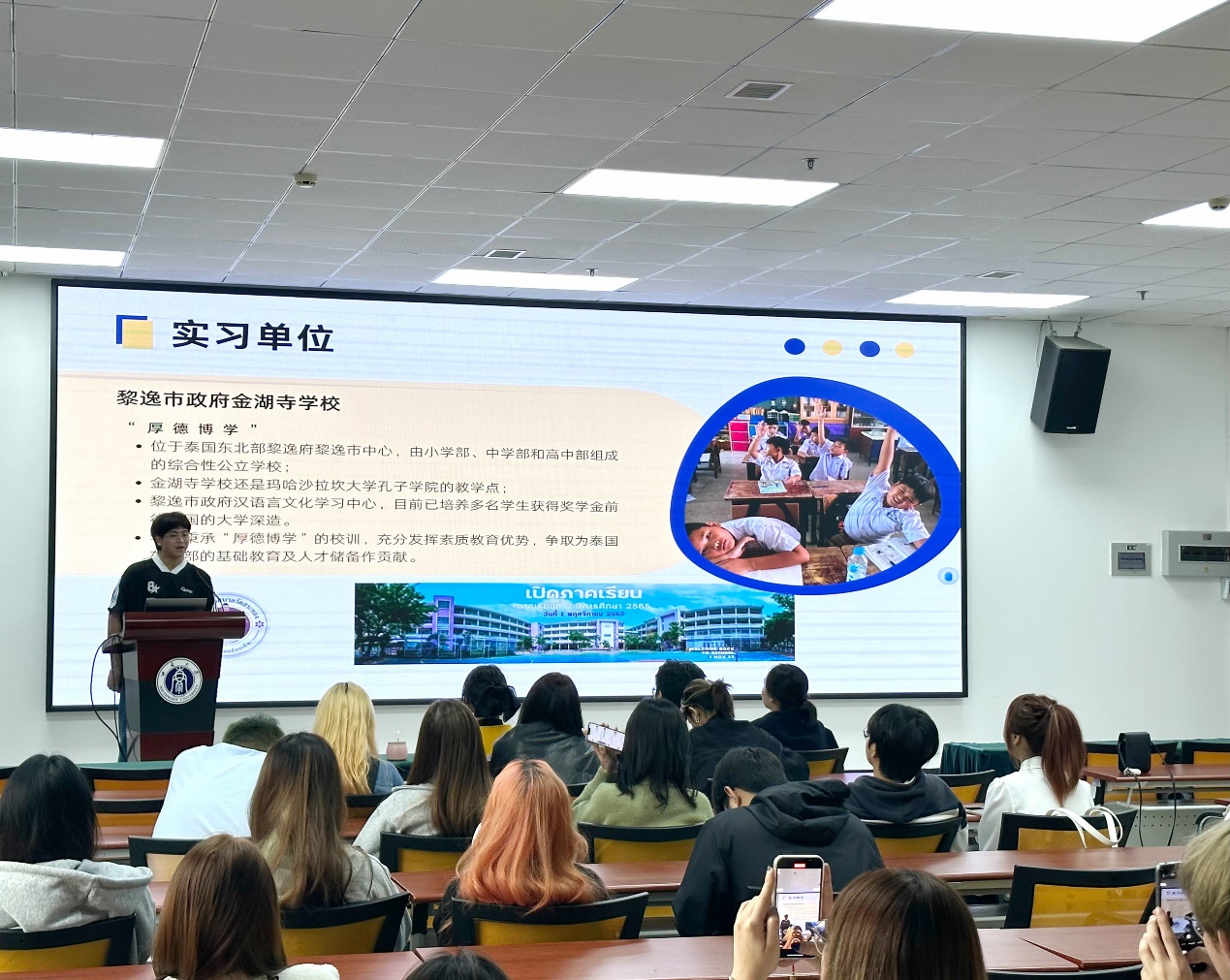 汉语国际教育本科20级B班姚崇同学从实习单位、实习时间、实习目标、实习过程和实习总结等方面,分享在黎逸市政府金湖寺学校的实习经历,表示,实习让他收获了很多,体会到了如何承担起老师的角色,也深深地感受到了作为一名本土汉语教师的责任与使命,也更加坚定了从事国际中文教育事业的决心。