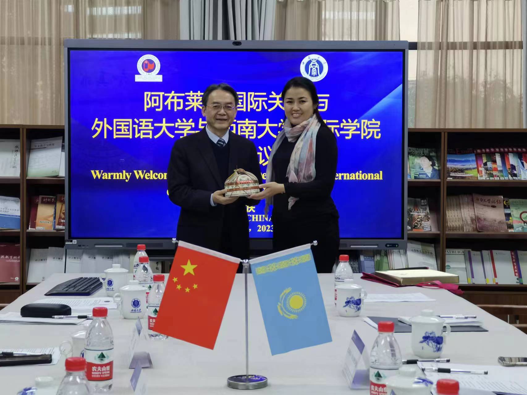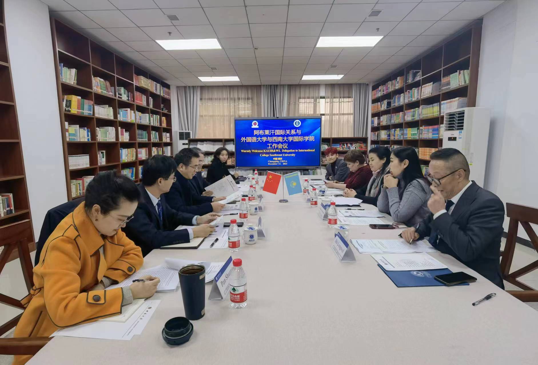 2023年12月12日下午,哈萨克斯坦阿布莱汗国际关系与外国语大学副校长扎纳尔·热尔特罗娃(Zhanar Zhyltyrova)、外事处处长汤索番·阿布迪伽拉尔(Tangsholpan Abdigappar)、东方学系主任艾里米拉·卡伽扎巴乌耶娃(Elmira Kagazbayeva)一行造访学校必赢776net。