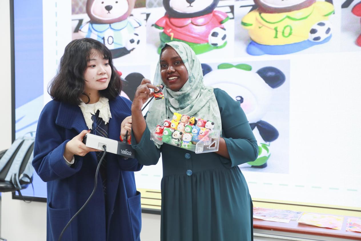 本轮活动巧妙使用同学们前一轮制作的小熊,每一个大组的同学将代表自己的小熊放在代表电影院座位的盒子里,组内讨论选择自己喜欢的位置。分享环节,现场同学通过几轮游戏得到情绪舒缓与解压,纷纷上台讲述今天与各国朋友相知相交的故事。其中一对好朋友分别来自中国和巴基斯坦,她们以“中国国宝”熊猫为原型,在小熊背面用巴基斯坦国语——乌尔都语写上了二人的名字,一旁绽放的友谊之花也是对中巴两国72年铁杆友谊的衷心庆贺。