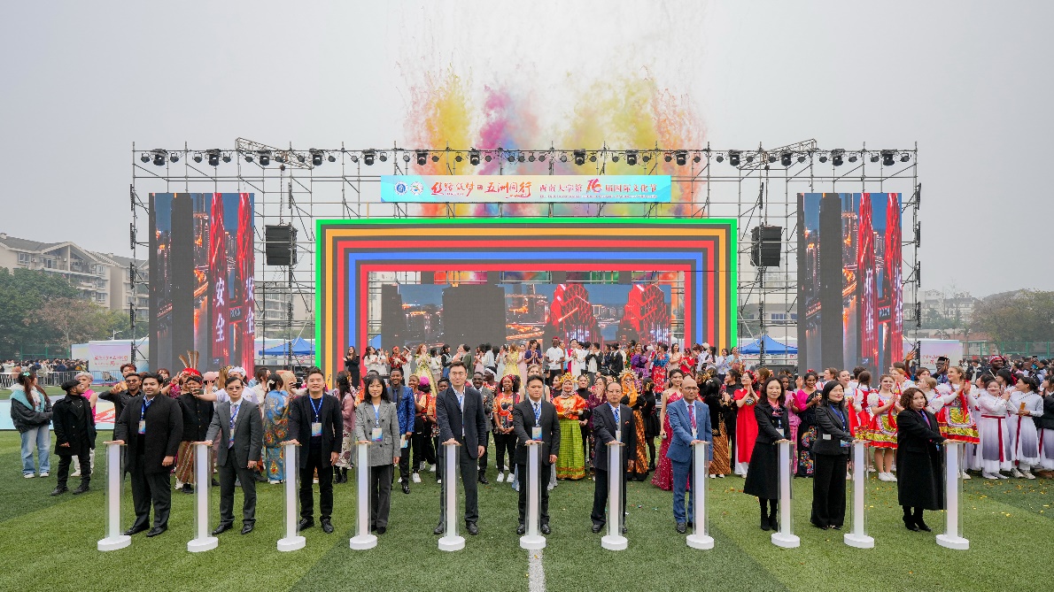 12月10日下午,学校第16届国际文化节盛大开幕。开幕式当天,中国教育国际交流协会、重庆市外办、市教委、市公安局出入境管理局、北碚区文旅委和区公安分局等部门相关领导,柬埔寨王国和缅甸联邦共和国驻重庆总领事馆总领事,巴基斯坦驻成都总领事馆代总领事,越南驻重庆工商部负责人,学校副校长周光明以及相关单位负责人莅临现场。来自100多个国家和地区的近千名国际学生在开幕式上呈现了独具风情的开场秀及文化展览,吸引了大批校内外人士前来观看和体验。