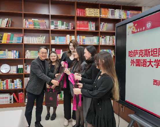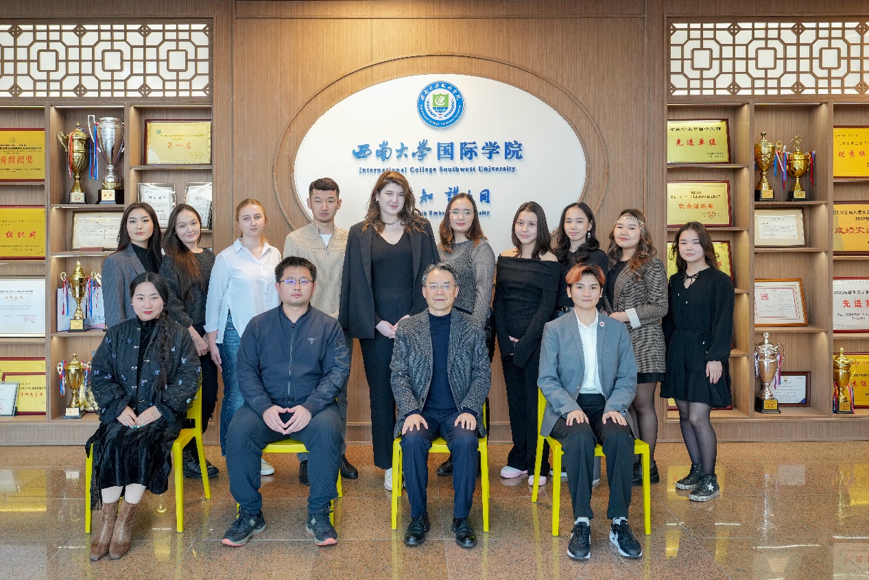 在校哈萨克斯坦籍学生代表刘月光发言。她结合自身经历讲述在重庆和西大的所见所闻,介绍学校的留学生生活,欢迎学弟学妹们来校学习,感受西大浓厚的学习氛围,享受北碚的宁静生活,品尝重庆可口的美食。