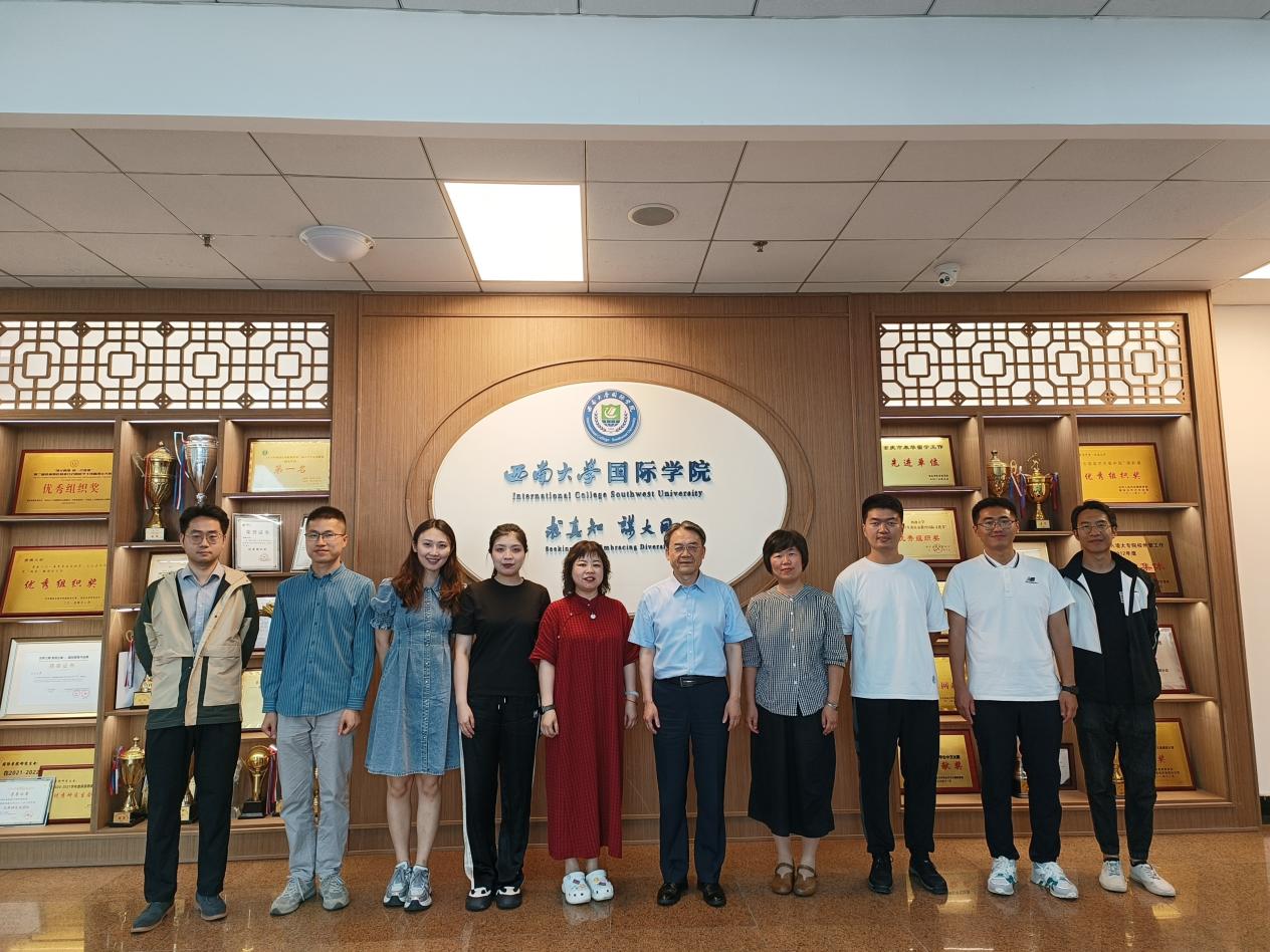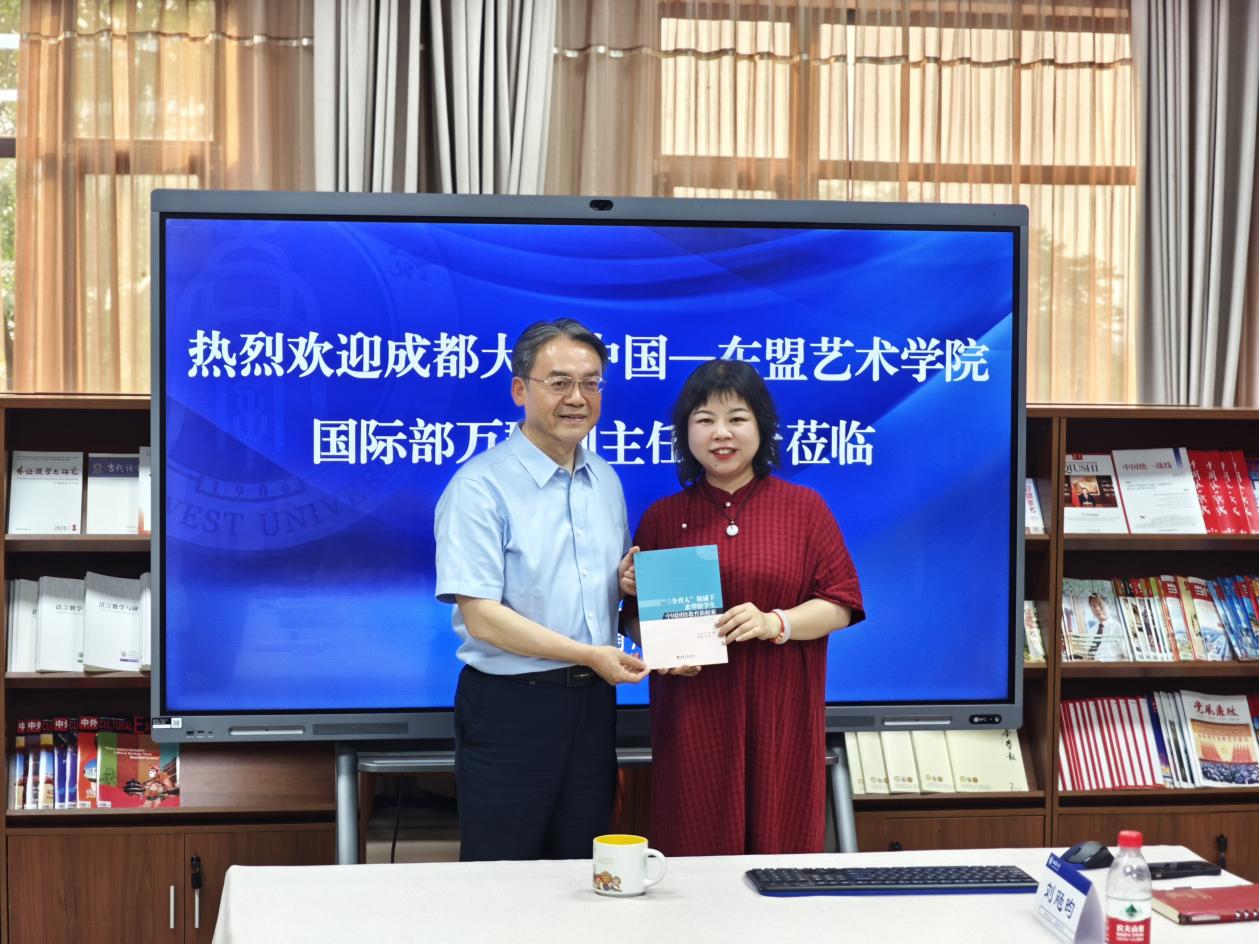 5月7日下午3点,成都大学中国-东盟艺术学院国际部副主任万群一行7人来学院开展调研。双方在紫云楼图书馆(316室)交流座谈,学院党委书记刘猛,学工办主任杨昆、研究生教研室主任陈晨参加座谈会。