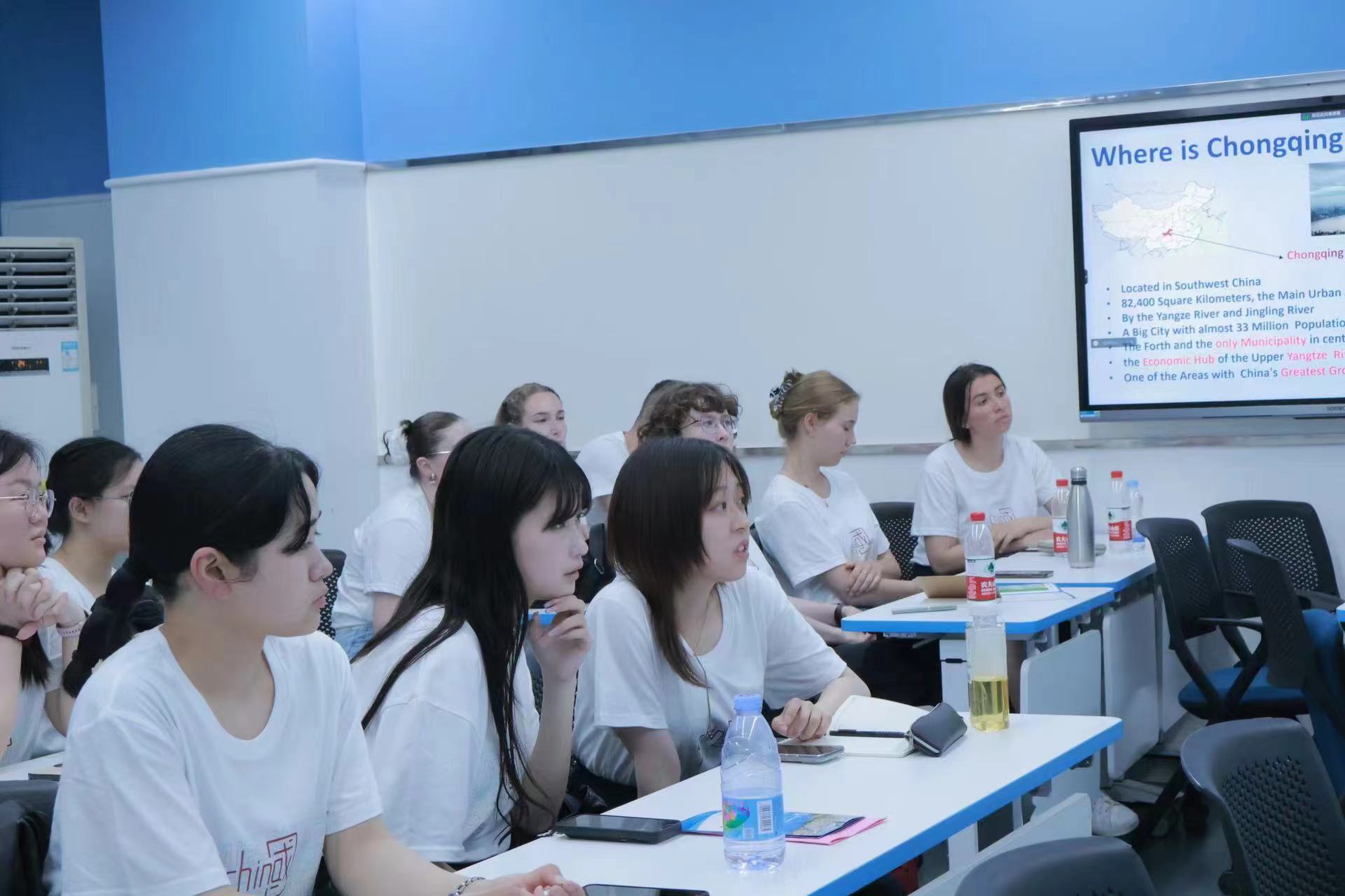 在秦洁教授的讲述中,现代化的重庆如影片般一帧帧放映在同学们的脑海中,开放的服务业、宜居的生态环境、全城捷运的轨道交通、配套的生产生活设施等,都带领国际学生们领略这座3D魔幻之都的魅力。