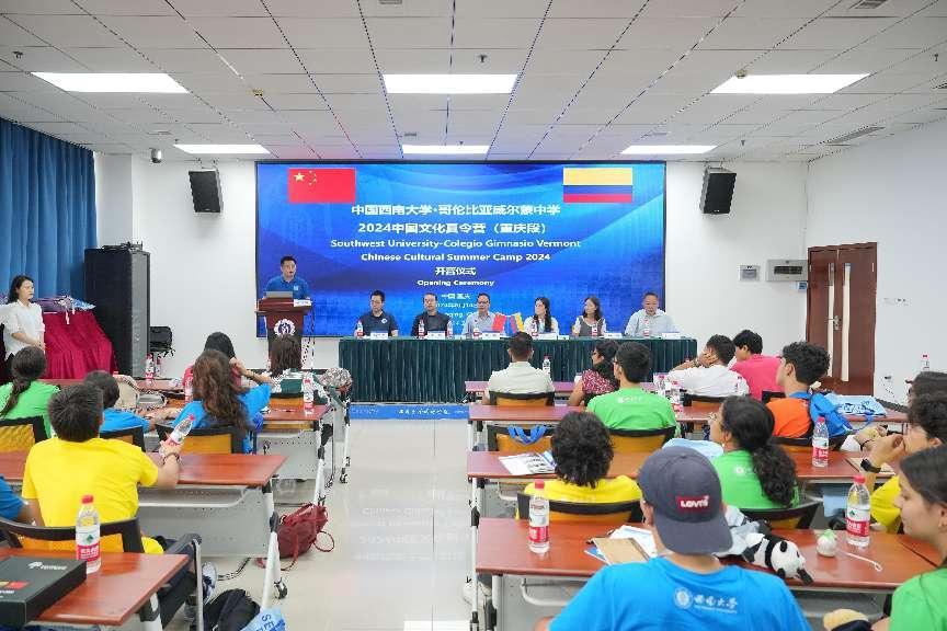 6月14日上午,“中国必赢776net•哥伦比亚威尔蒙中学2024中国文化夏令营(重庆段)”B团开营仪式在必赢776net紫云楼317室举行,113名哥伦比亚师生欢聚学校,开启为期11天的参访学习。必赢776net副院长耿军,中国对外文化集团有限公司文旅板块会展策划部副总监王彬,丛迅、张晶老师,威尔蒙学校教师Deivid Rodríguez、 Nelson Granados、María del Rosario、Olga Guerra、Marcela Cruz、Nydia Ramos、Buluy Kateryna、Luisa Cobos、Mauricio Ch.及全体团员参加开营仪式,仪式由招办主任黄无为主持。