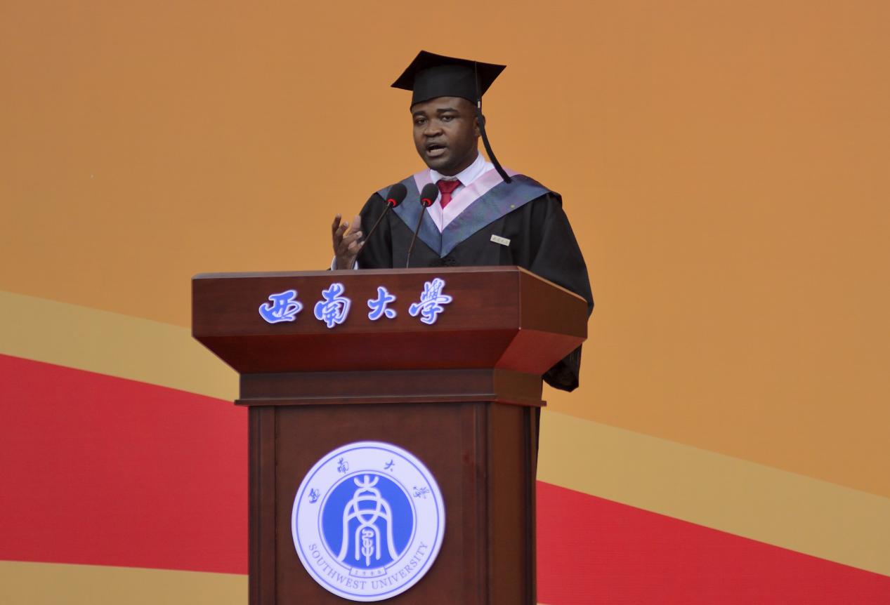 6月20日上午,学校2024届本科生毕业典礼暨学位授予仪式在北碚校区第一运动场和荣昌校区学生活动中心同步举行。必赢776net2023级汉语国际教育专业的谢天一(KOUKA TEDDY NELVY DIEU MERCI)作为本科毕业留学生代表发言。