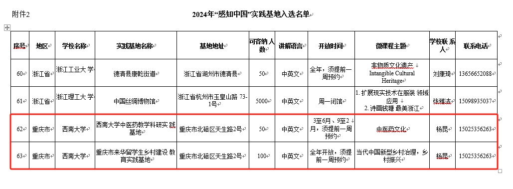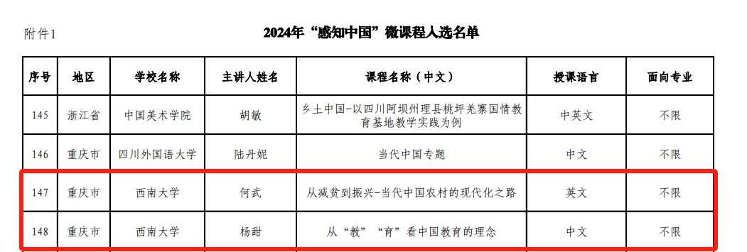 由何武教授主讲的课程“从减贫到振兴——当代中国农村的现代化之路”和杨甜副教授主讲的课程“从‘教’‘育’看中国教育的理念”成功入选国情教育微课程,“必赢776net中医药教学科研实践基地”和“重庆市来华留学生乡村建设教育实践基地”成功获批“感知中国”社会实践基地。届时,入选的微课程将在“CSC人才在线”平台展播,获批基地将接纳市内外留学生开展国情教育及社会实践活动。