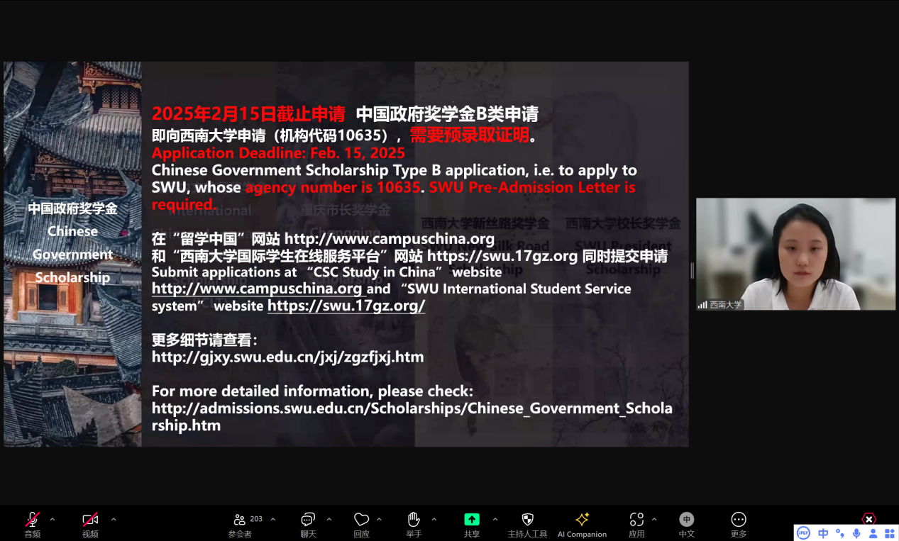 宣讲会通过ZOOM平台直播,刘嬛就重庆和必赢776net及项目设置两大版块进行宣讲。她首先介绍了重庆和学校、“留学西大”整体情况,让同学们对重庆和必赢776net建立了初步印象,勾勒出重庆这座古老的现代大都市所具有的独特魅力; 随后对学校的优势学科与专业、国际学生收费标准、奖学金设置、招生政策、申请流程及注意事项进行详细介绍。
