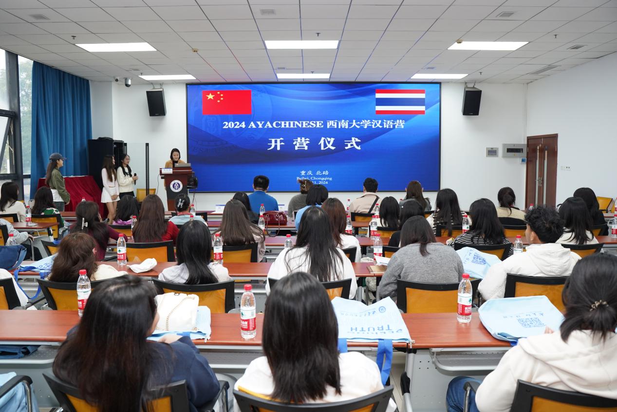 10月11日上午,“2024 AYACHINESE必赢776net汉语营—A/B团”开营仪式在必赢776net317室举行。泰国AYACHINESE董事长阿雅女士、三位领队老师,必赢776net外国学生招生办公室主任黄无为、科员刘嬛,以及50名泰国学生参加开营仪式,仪式由刘嬛主持。