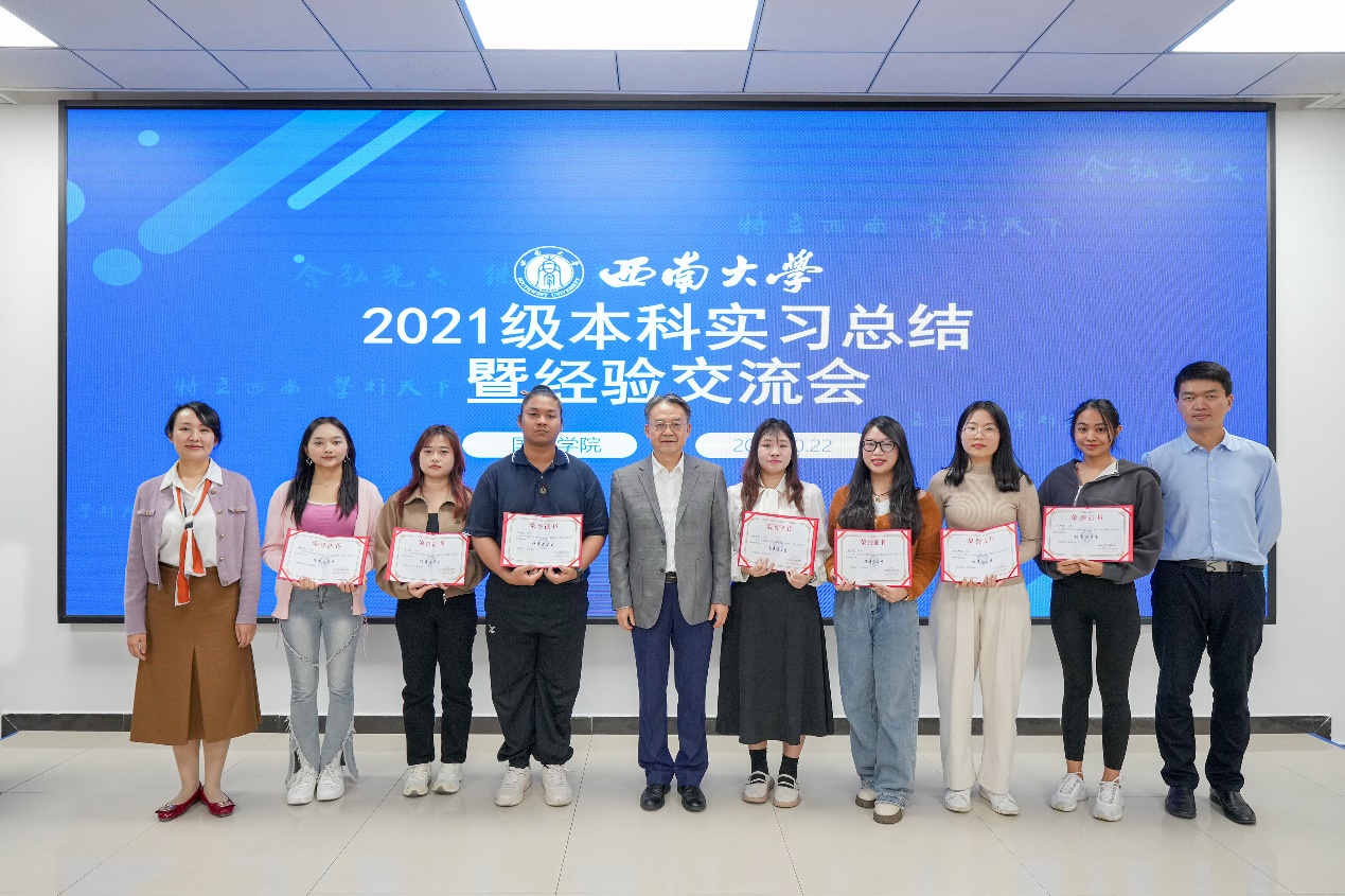 经过综合实习考核评定,陈氏竹薇等7位优秀实习生荣获“优秀实习生”称号,刘猛书记、杨甜主任、杨昆主任为同学们颁发荣誉证书。