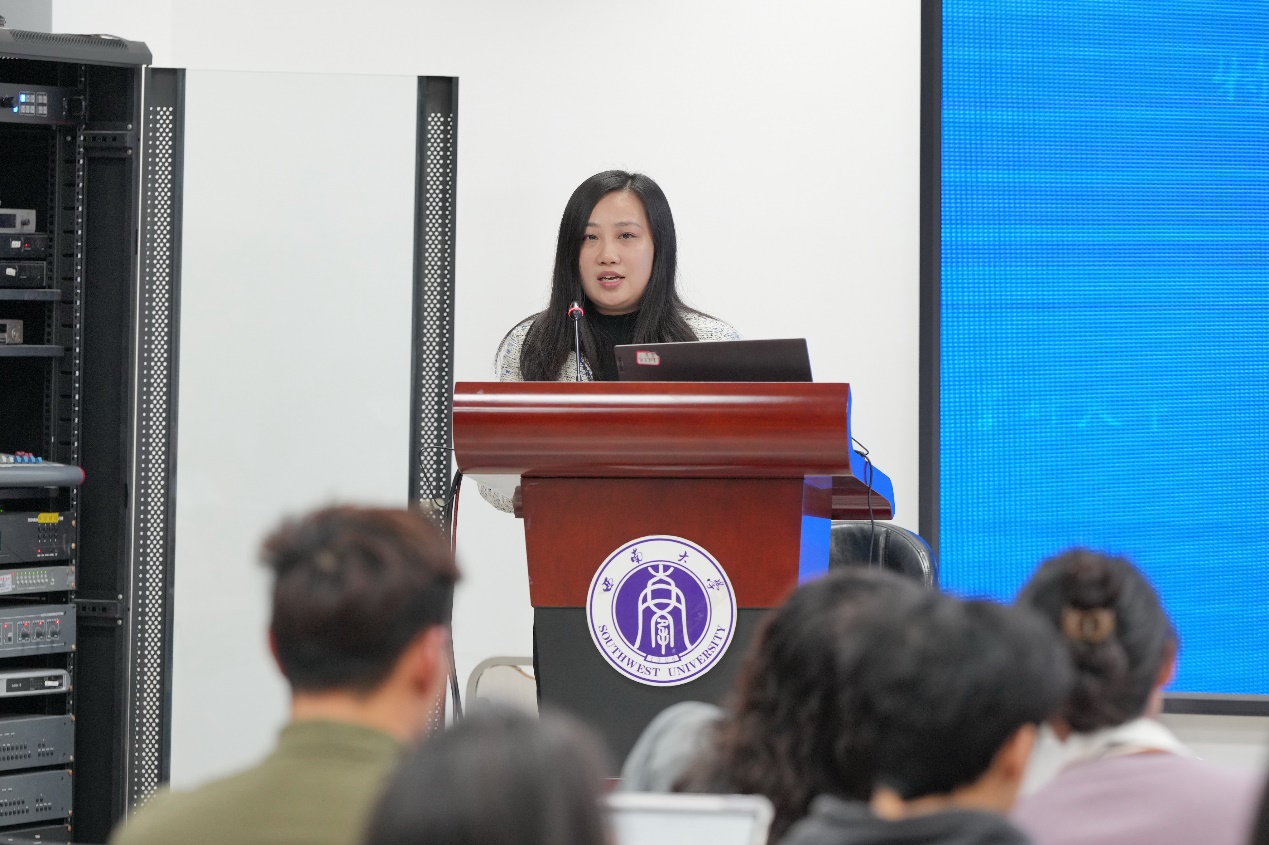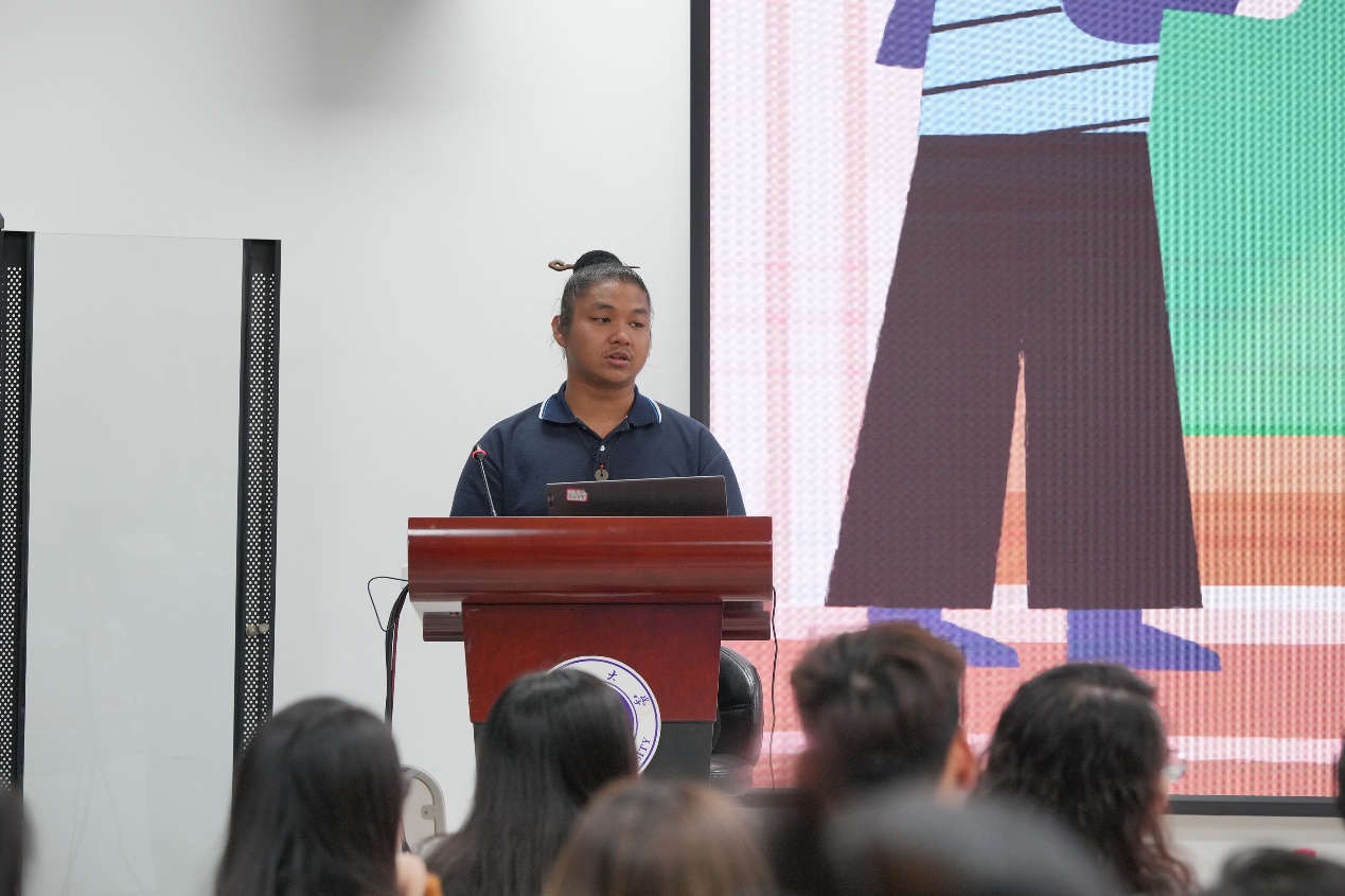 汉语言文学专业班的林小龙同学介绍了他在泰国宋卡府国光慈善学校的实习经历。他条理清晰地讲述了实习期间的工作职责,并用视频生动再现了其编排的中华文化推广活动的精彩瞬间,分享了实习过程中的感悟与收获,表示自己在实践中取得了显著成长。