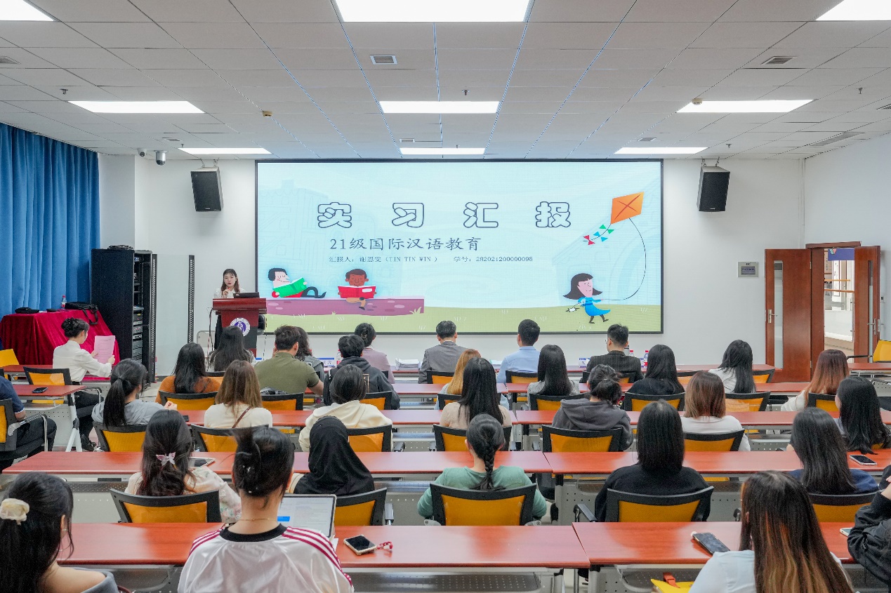在实习生代表发言环节,汉语国际教育本科班的谢恩雯同学分享了她在缅甸本土知名的国际学校乐华国际教育的实习经历,并感慨道:“实习学校并未将我视为实习生,而是按照正式教师的标准来培养,让我迅速成长。”