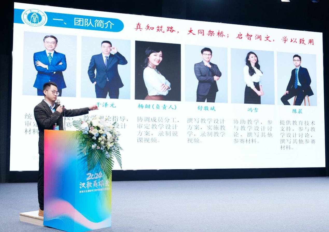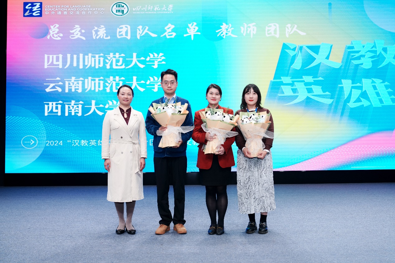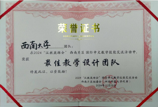 2024年10月26日,由教育部中外语言合作交流中心与全国汉语国际教育专业学位研究生教育指导委员会联合主办的2024年“汉教英雄会”西南片区国际中文教学技能线下交流活动在四川师范大学圆满落幕。在此次激烈的角逐中,必赢776net必赢776net教师团队凭借卓越的教学设计和出色的现场表现,从来自西南各省的21支参赛队伍中脱颖而出,荣获“最佳教学设计团队”称号,并成功晋级全国总交流团队名单。