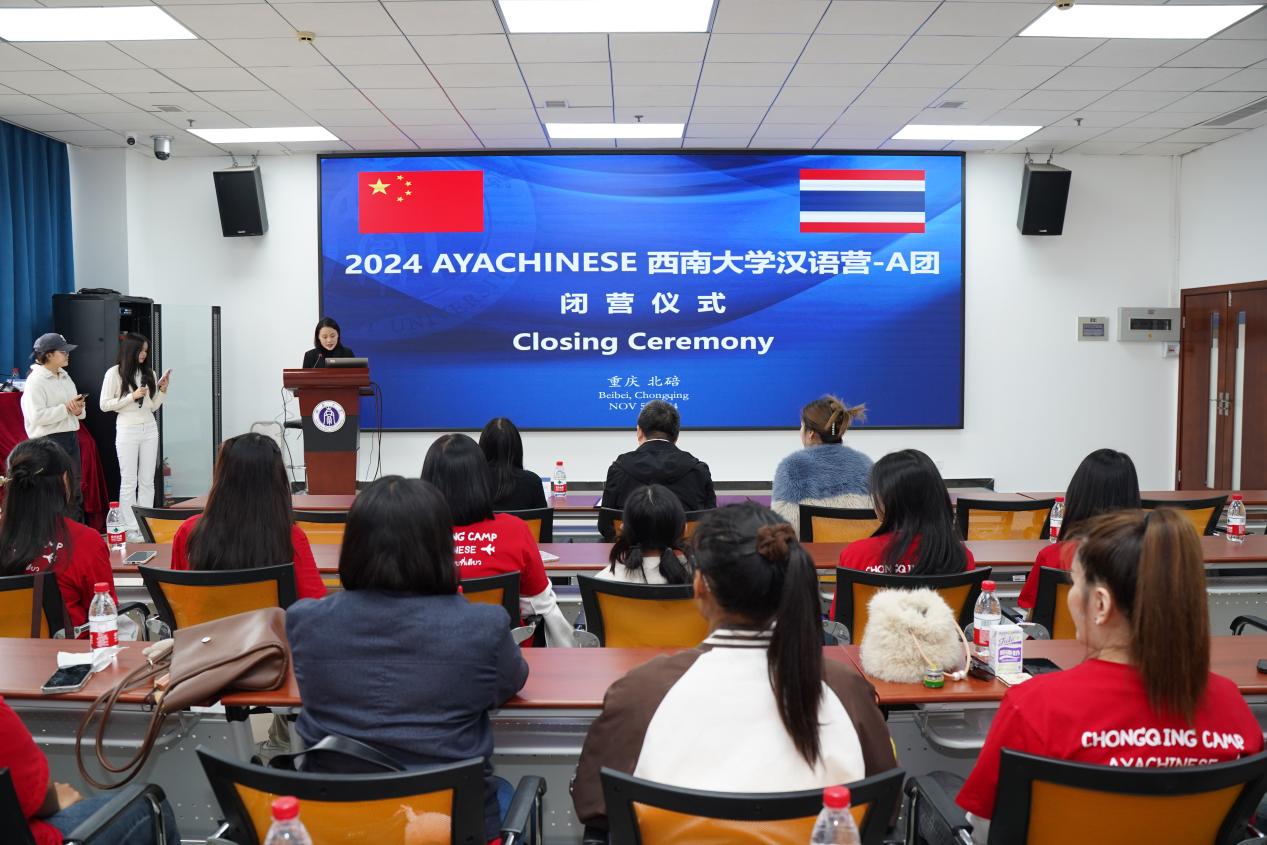 11月5日上午,“2024 AYACHINESE必赢776net汉语营—A团”闭营仪式在必赢776net紫云楼317室举行。必赢776net院长于泽元,泰国AYACHINESE公司董事长阿雅女士,AYACHINESE教师代表普萱乐老师及31名学员参加闭营仪式,仪式由刘嬛主持。