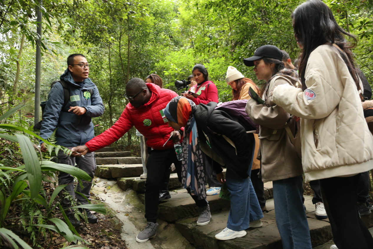 午餐与短暂休息后,国际学生们化身 “公民科学家”,在植物专家讲师的引领下走进缙云山森林。他们充分调动视觉、听觉、嗅觉、触觉等所有感官,去探寻森林生态系统的奇妙之处。